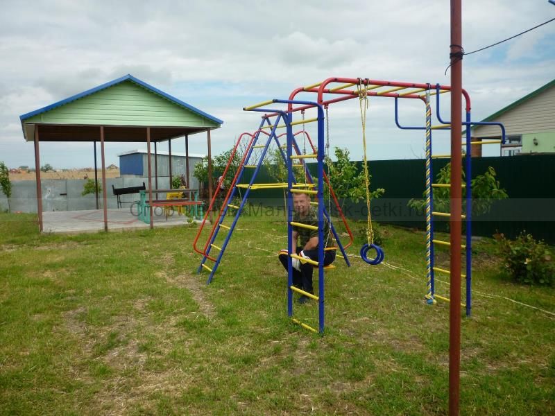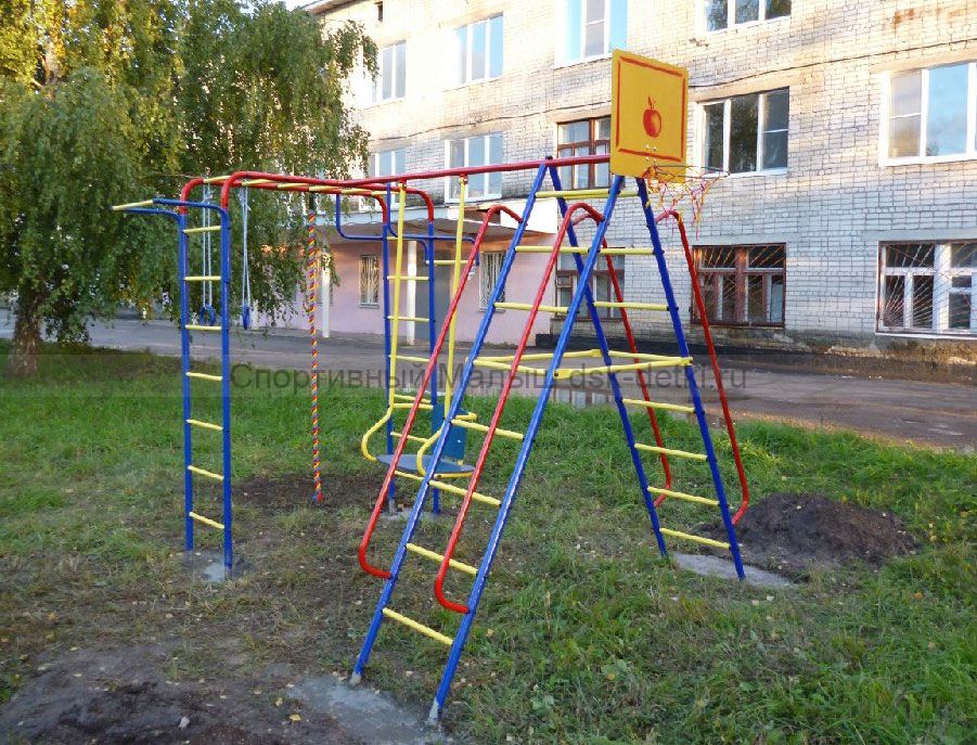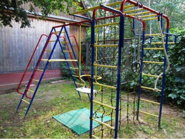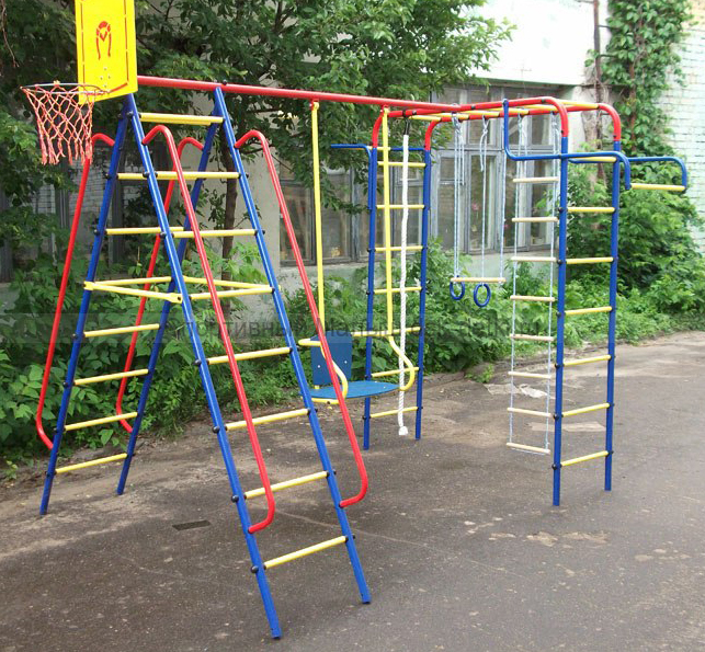 1) комплекс в металлическом корпусе с двумя вертикальными и двумя наклонными шведскими стенками, горизонтальным рукоходом, двумя турниками (неподвижный и подвижный)