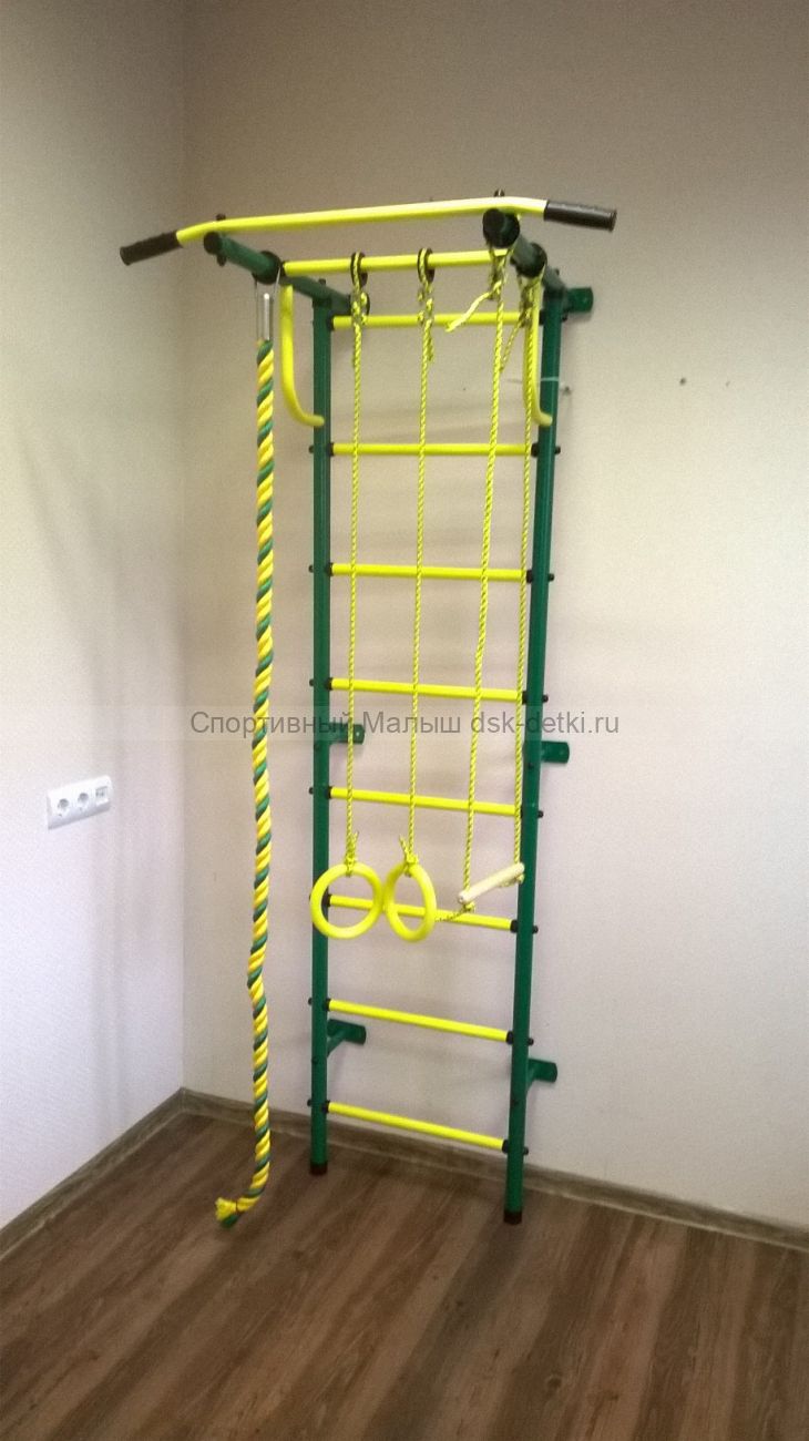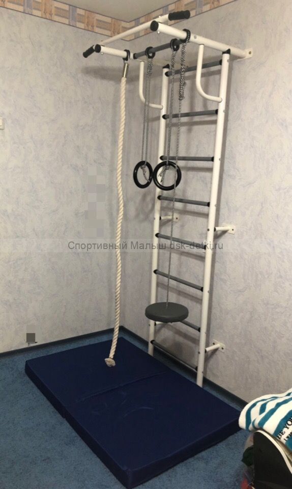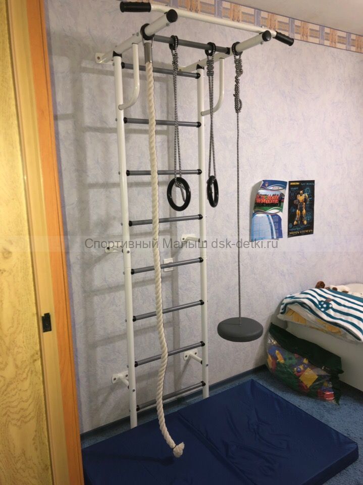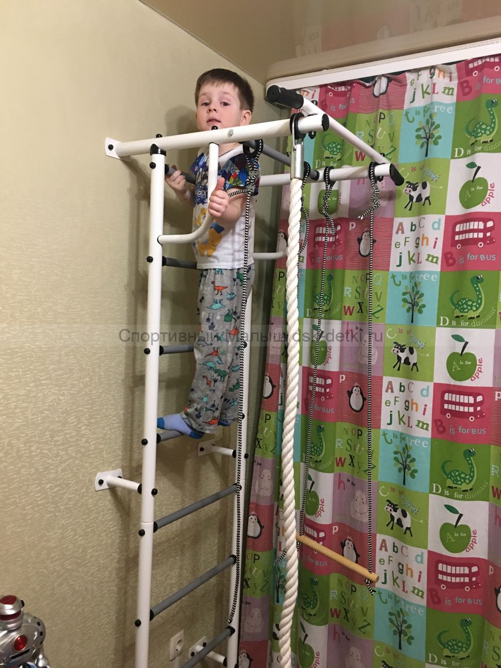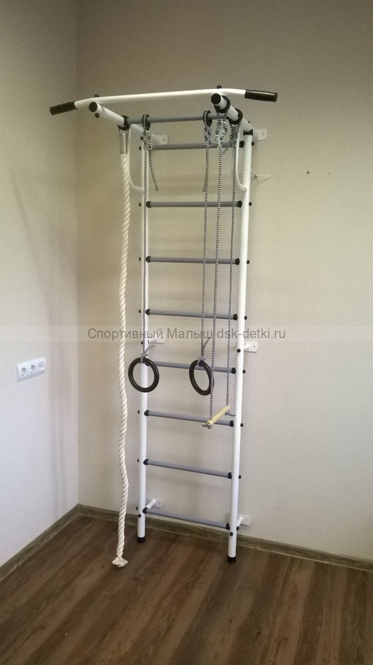 Домашний детский спорткомплекс в металлическом корпусе. Отличие от модели Пионер-С2Н - разрезные стойки вместо единых монолитных для уменьшения размера упаковки, 6 точек крепления к стене и тип турника.