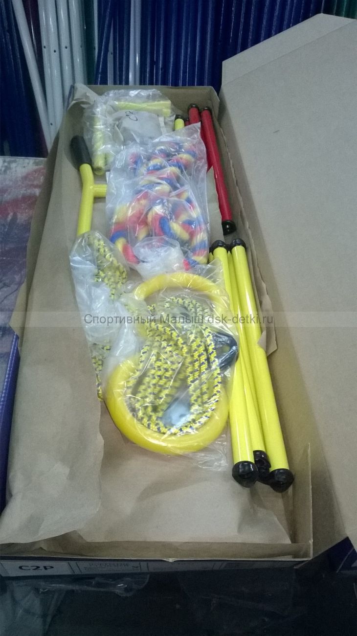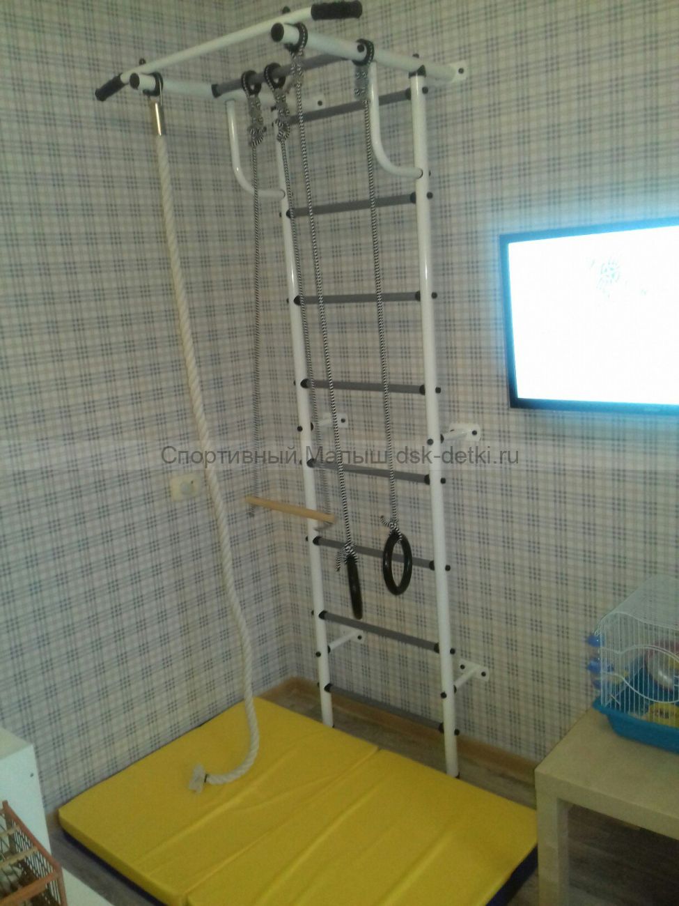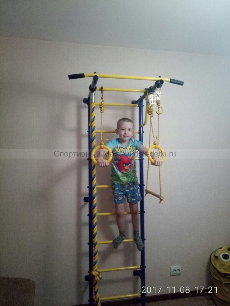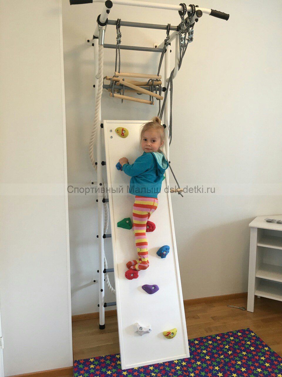 Домашний детский спорткомплекс в металлическом корпусе. Отличие от модели Пионер-С2Н - разрезные стойки вместо единых монолитных для уменьшения размера упаковки, 6 точек крепления к стене и тип турника.