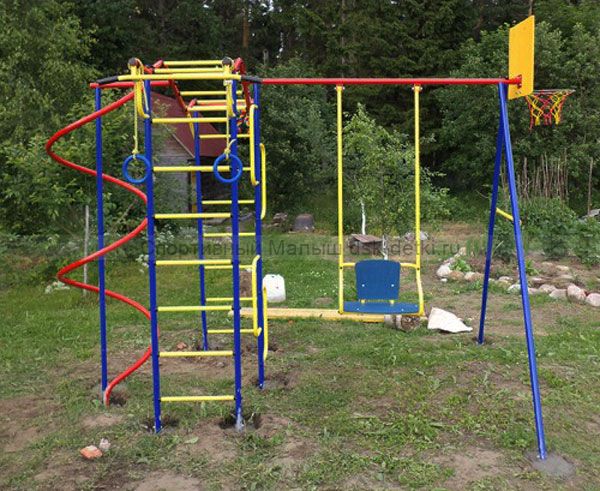 1) комплекс в металлическом корпусе с двумя шведскими стенками, изогнутым рукоходом и зацепами для лазания и неподвижным турником (спираль не входит в базовый набор и приобретается отдельно по желанию)
