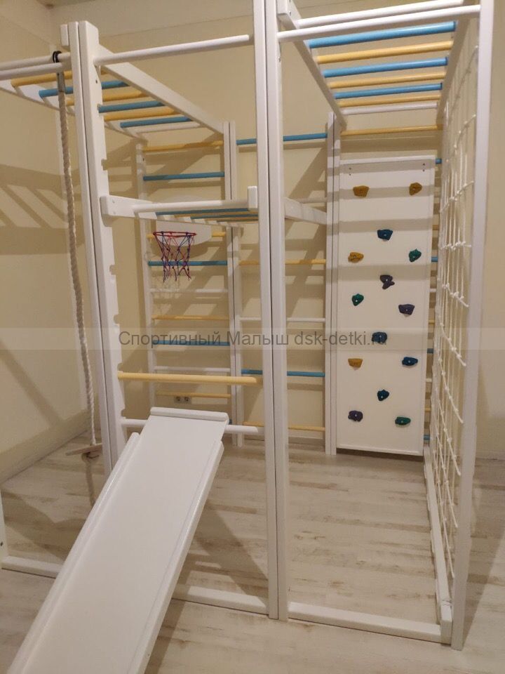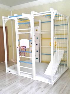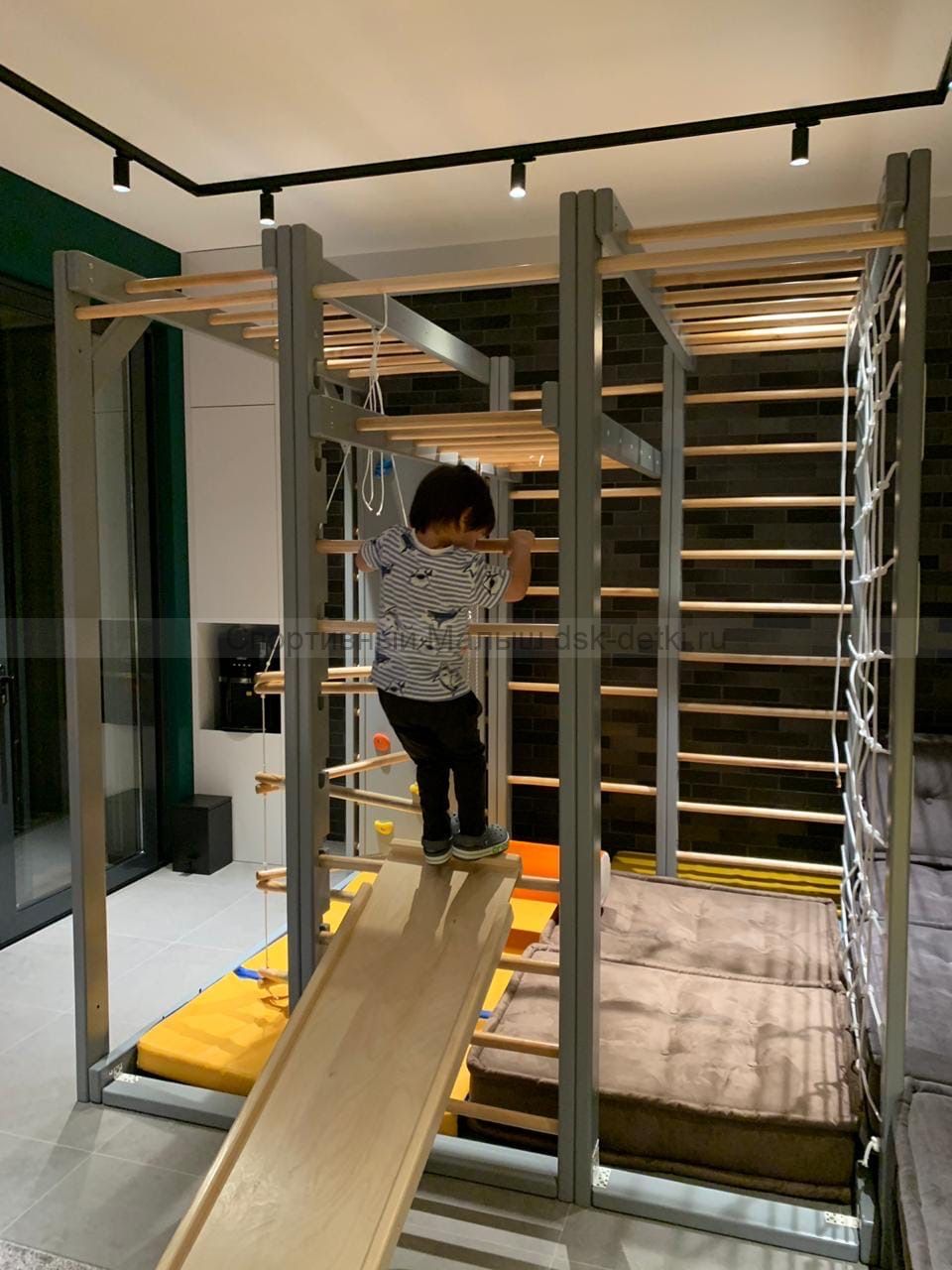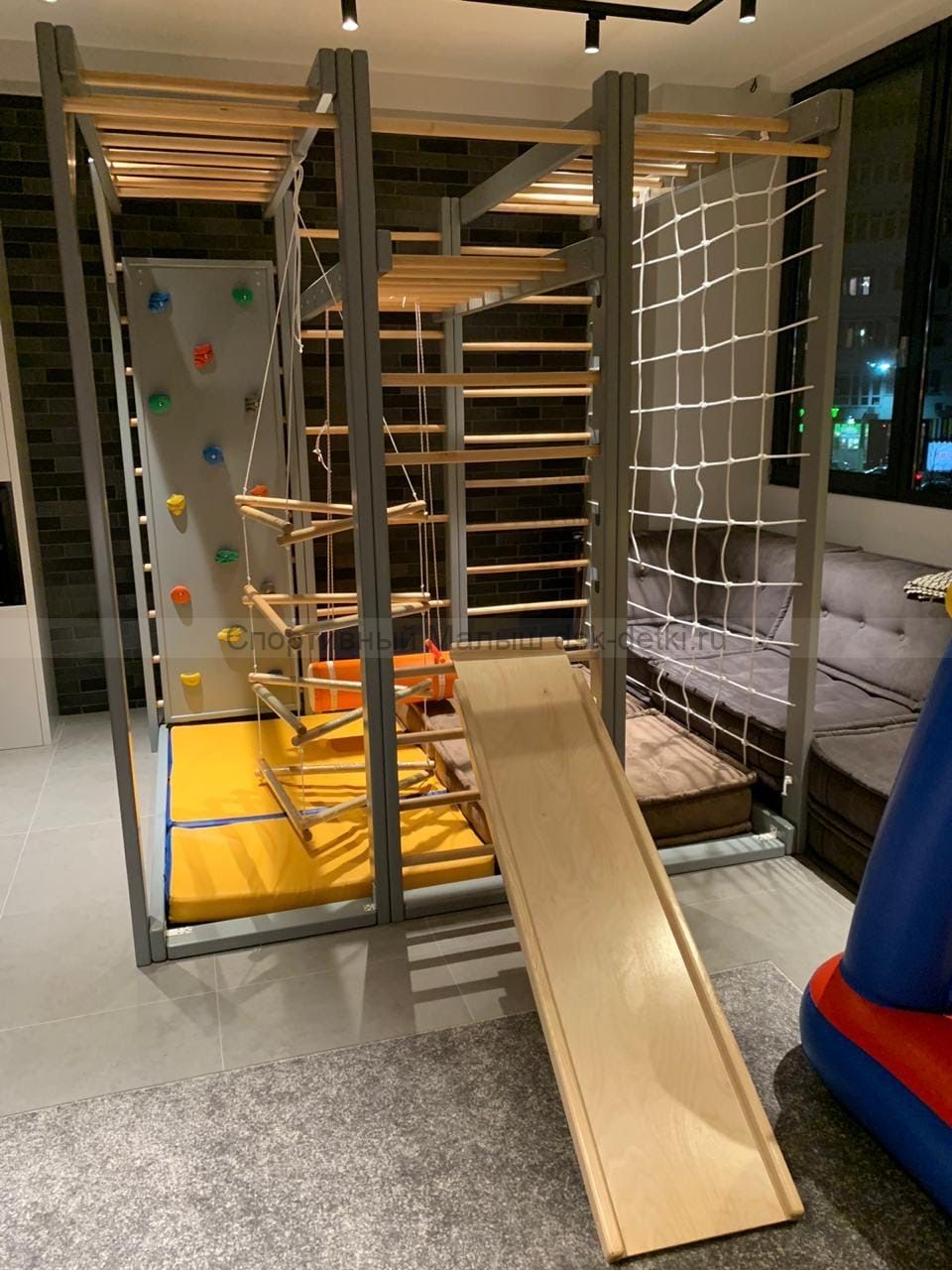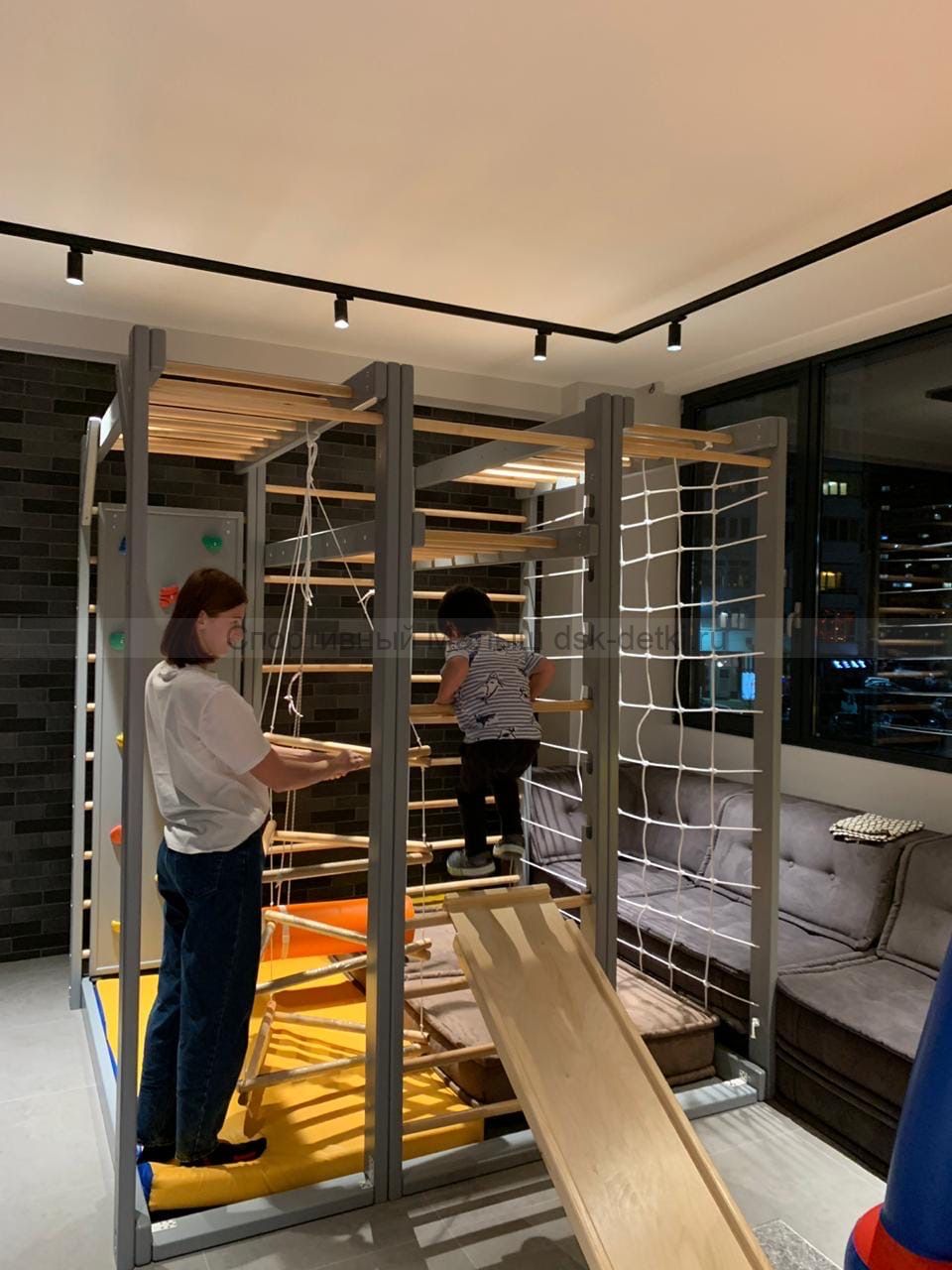 Большая домашняя площадка из дерева для детей. За счет кубической формы конструкция может быть установлена на пол без дополнительных креплений. При желании в комплектацию будут включены стальные анкеры крепежа к стене и/или полу (обсуждается при согласовании заявки).