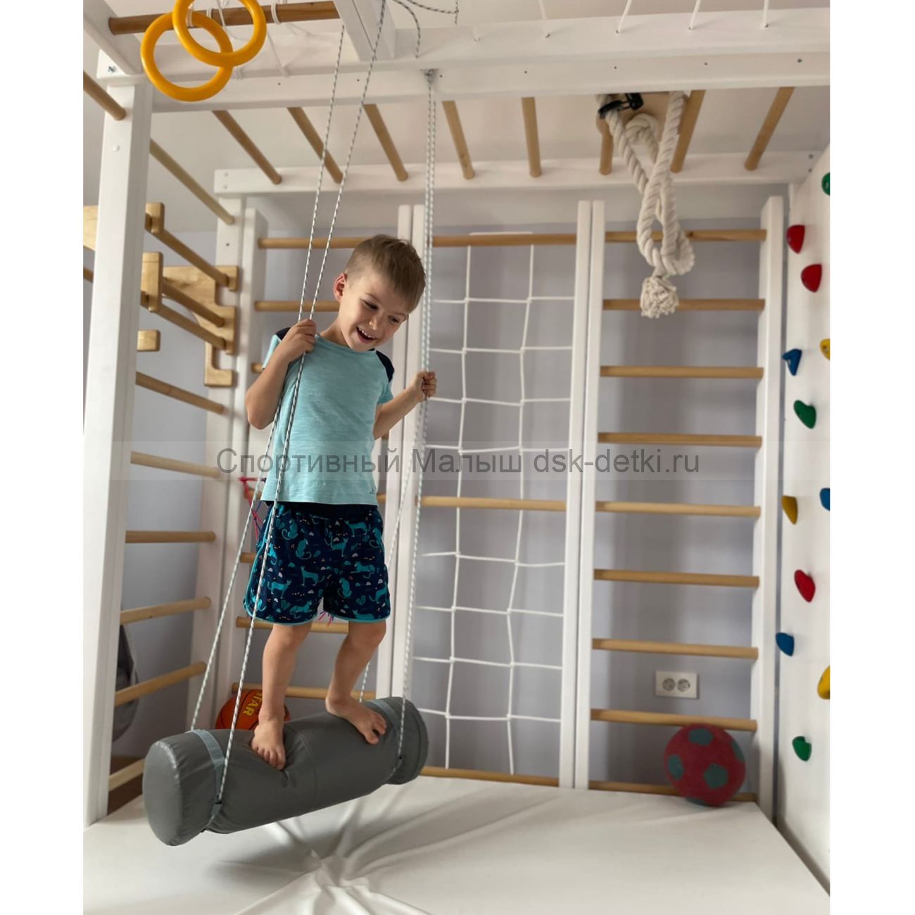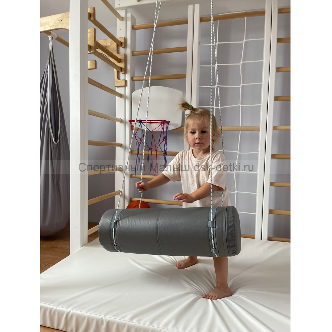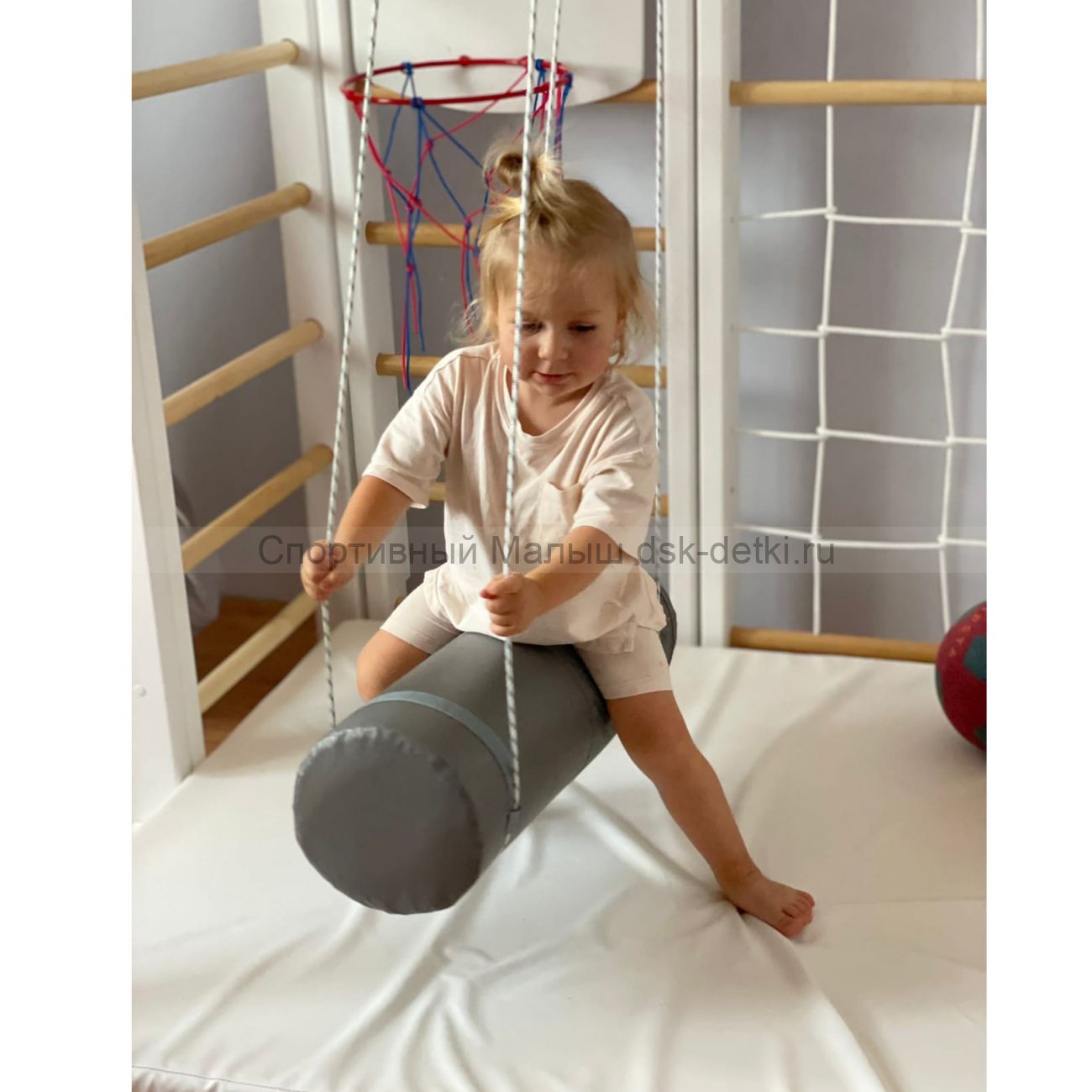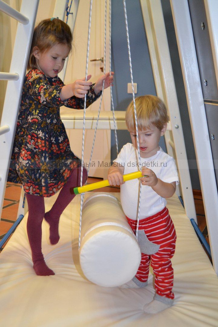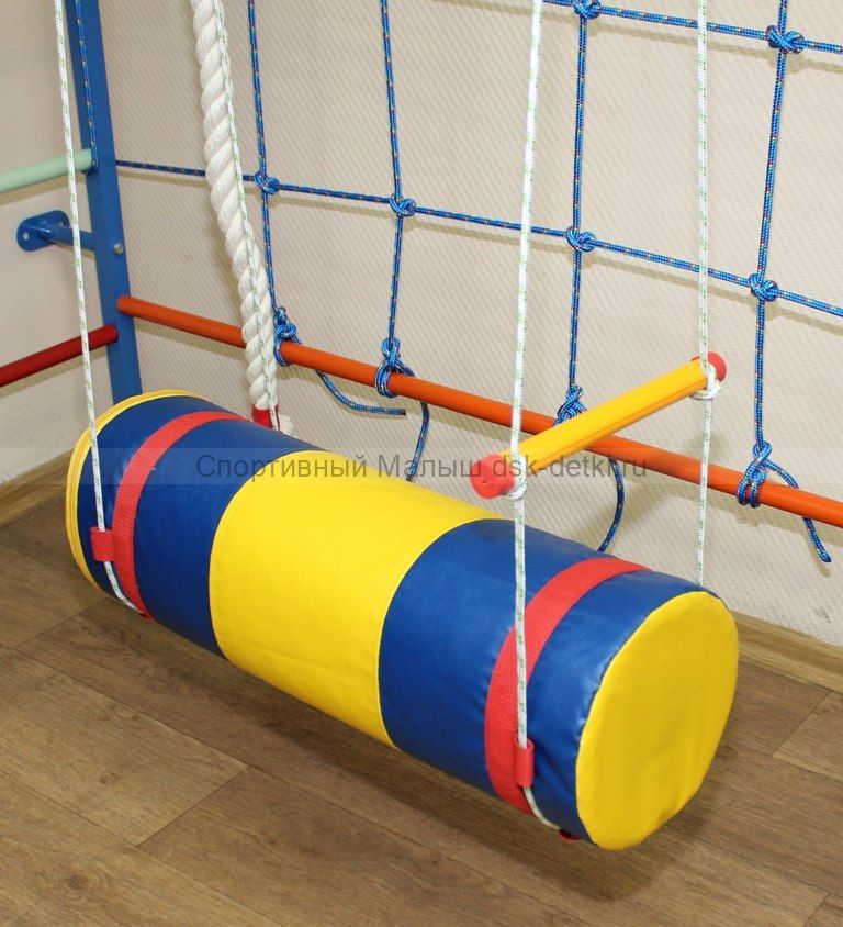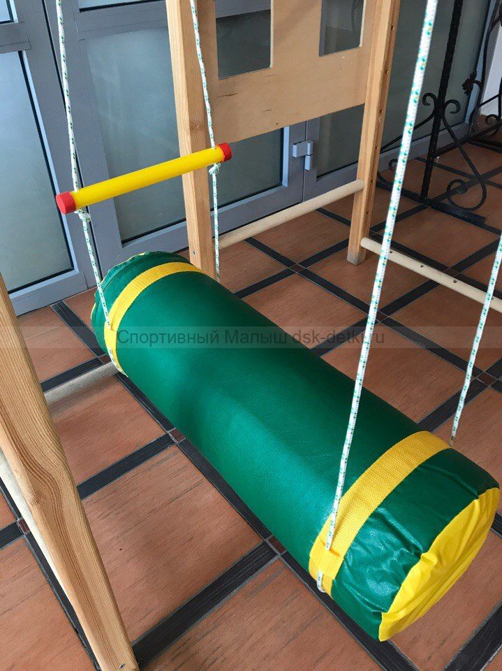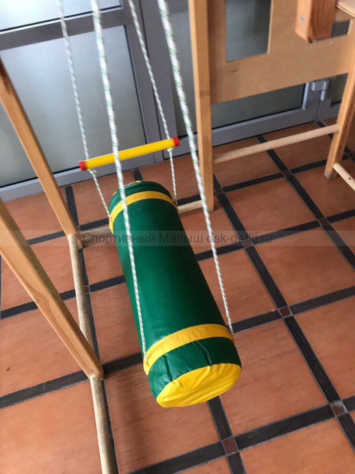 Груша-цилиндр с жесткой сердцевиной в основе и мягкой поролоновой поверхностью для удобства сидения. Снаряд позволяет ребенку сидеть на нем, как на коне, крепко держась за трапецию.