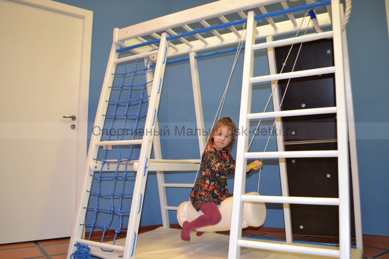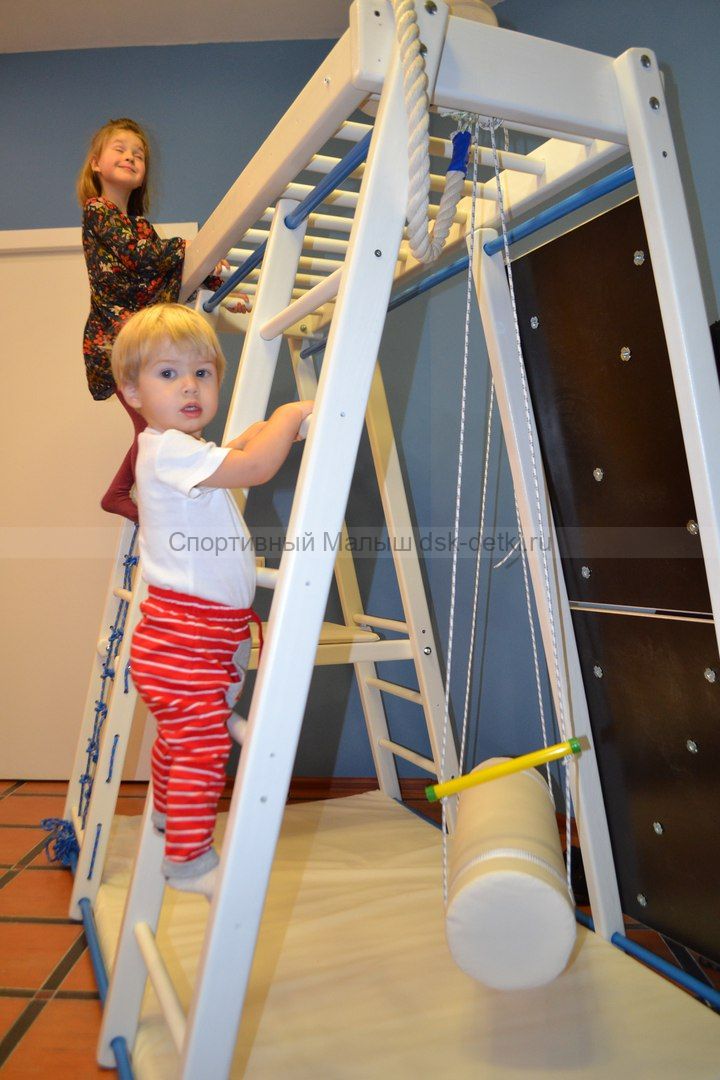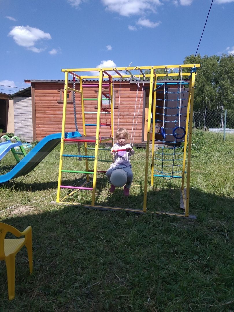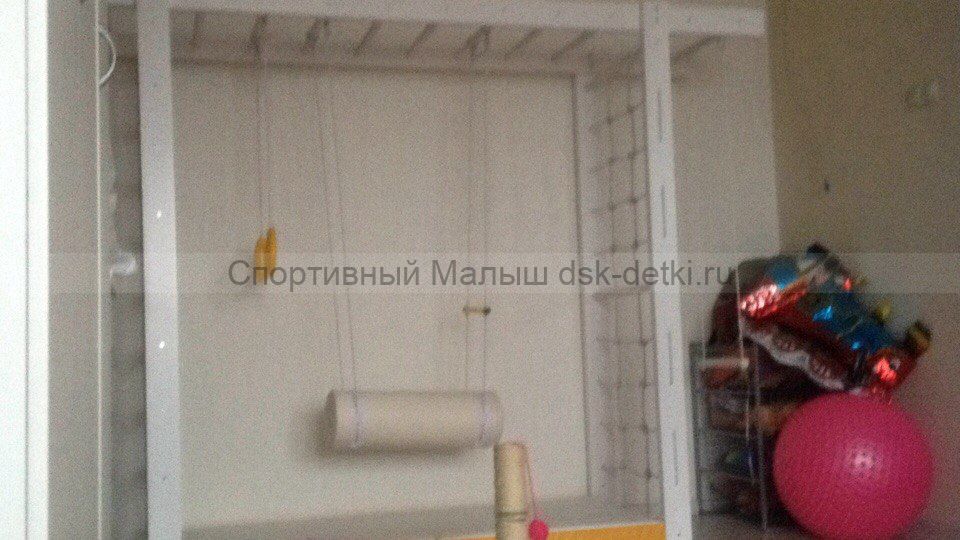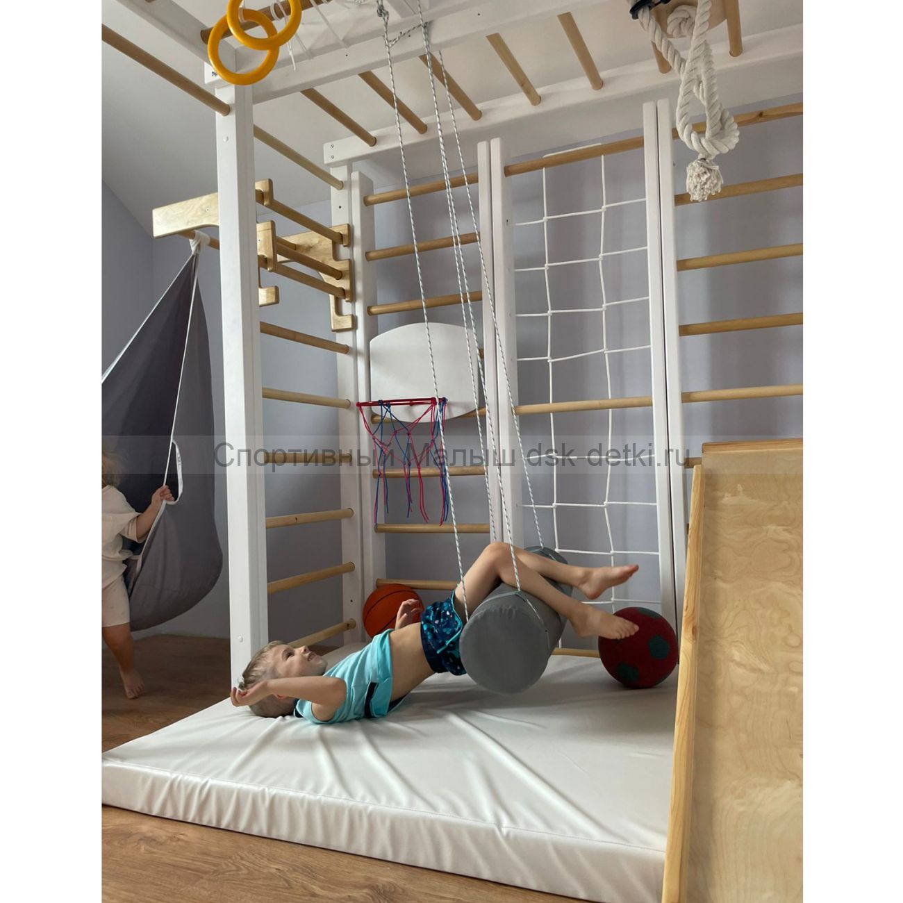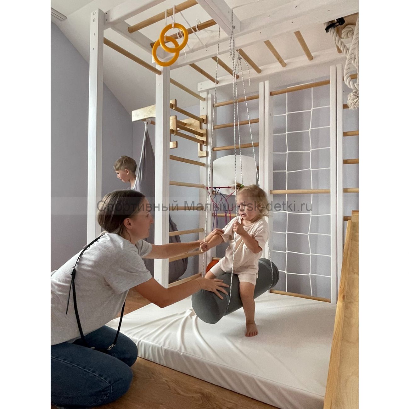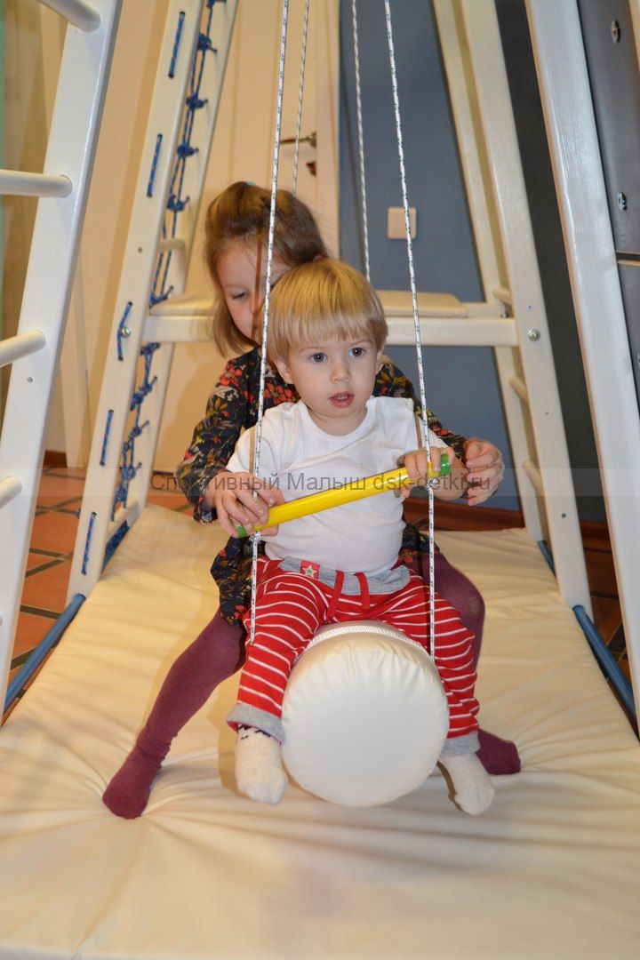 Груша-цилиндр с жесткой сердцевиной в основе и мягкой поролоновой поверхностью для удобства сидения. Снаряд позволяет ребенку сидеть на нем, как на коне, крепко держась за трапецию.