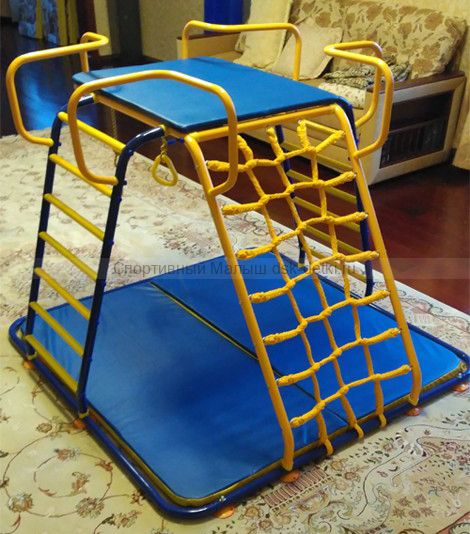 Двухэтажный детский спортивно-игровой центр для дома и улицы. Напольная установка, не требующая фиксации к полу/почве или стене. В комплекте сетка для лазания, две гимнастические лесенки для подъема/спуска и пиратскаяч площадка с мягким настилом.