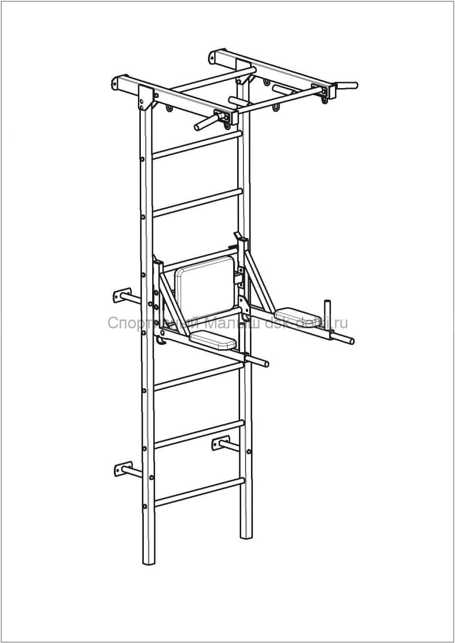 Г-обрзный корпус комплекса состоит из гимнастической лестницы с прорезиненными перекладинами и встроенного турника с двумя типами хватов (широким и параллельным).