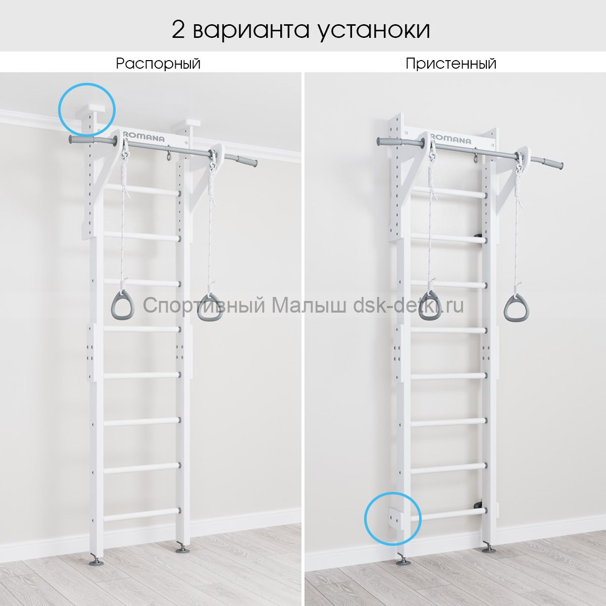 Шведская стенка может имеет 2 типа крепления и может быть установлена как к стене так и враспор.