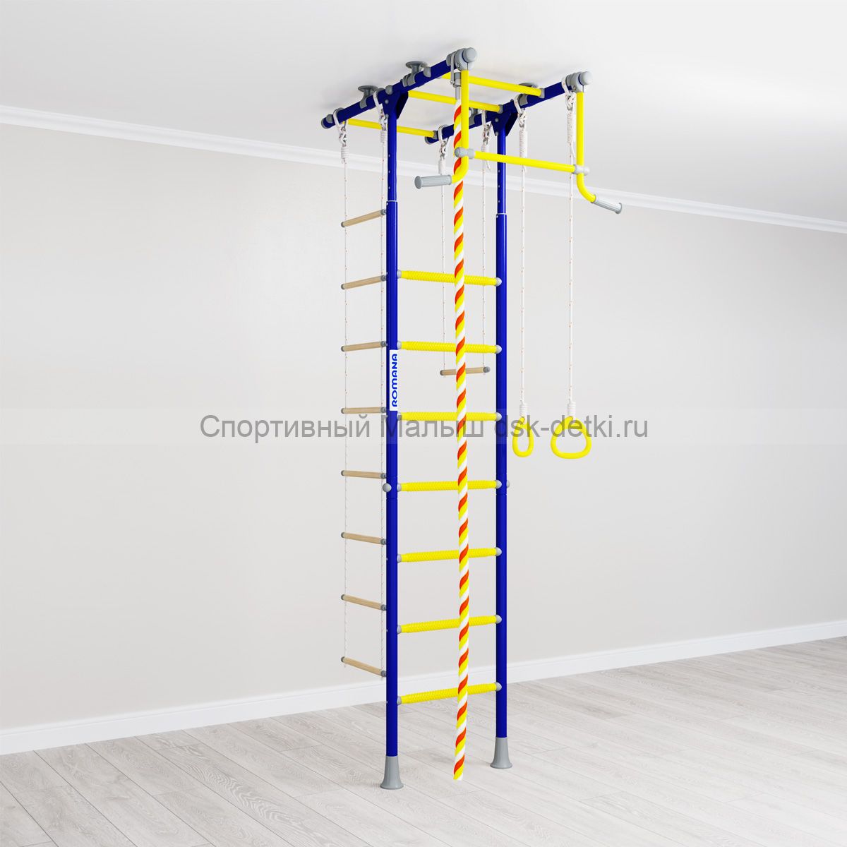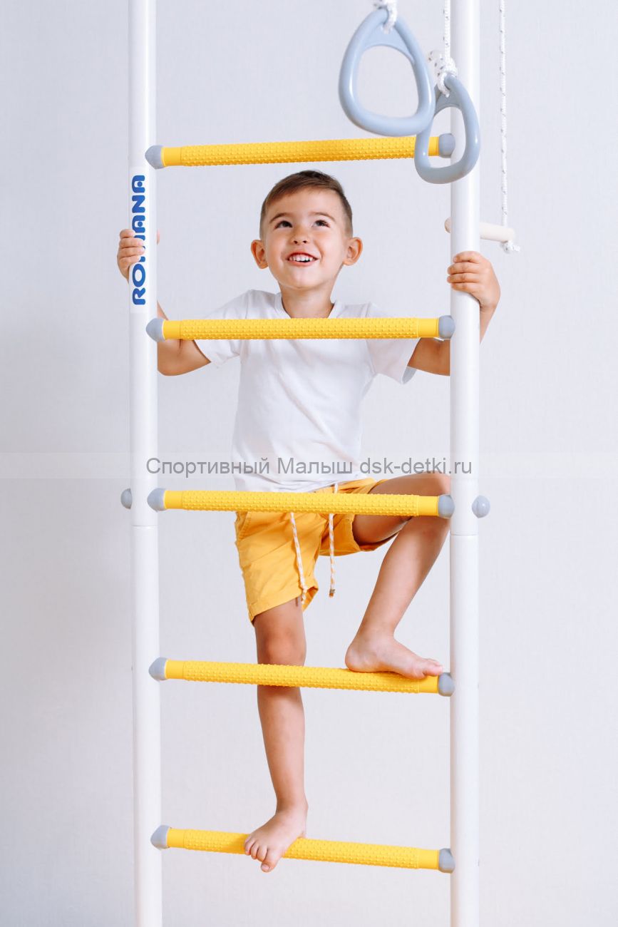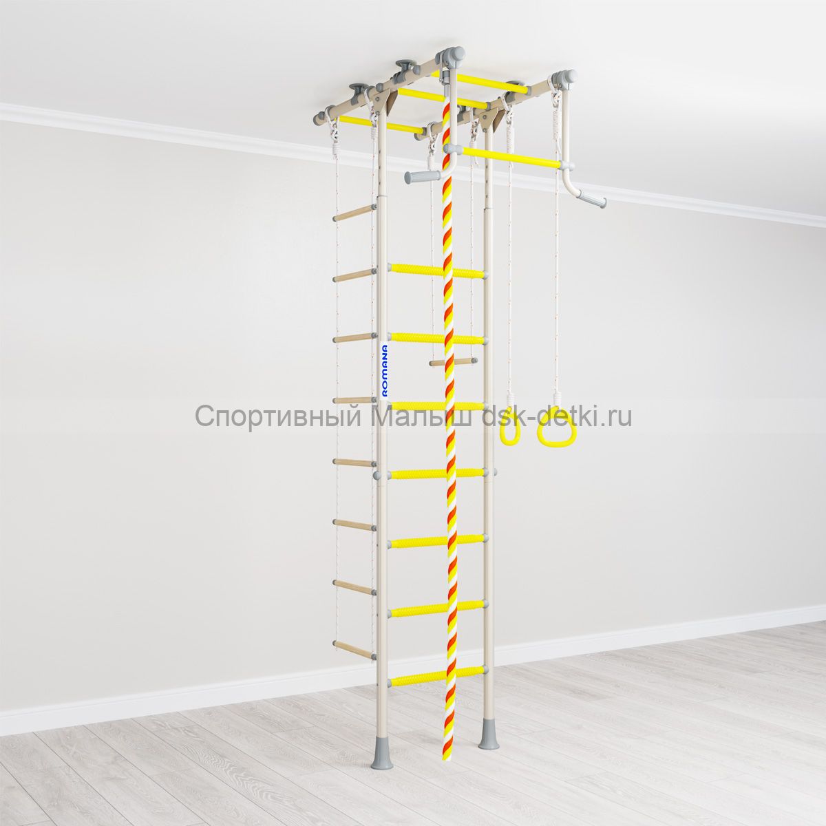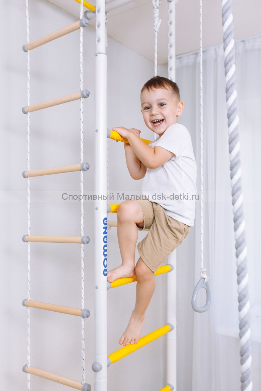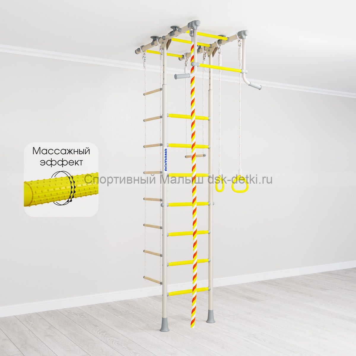 Комплекс ROMANA R1 был обновлен в 2017 году. Теперь у него яркие, теплые цветовые гаммы, которые гораздо лучше подходят для интерьеров детских комнат. Обновлены цвета стоек, каната, навески. Фурнитура получила приятный серый цвет вместо черного.