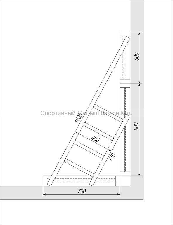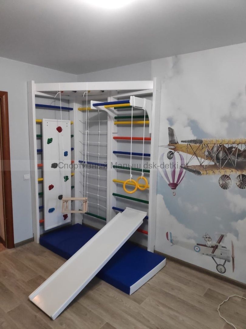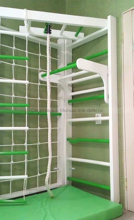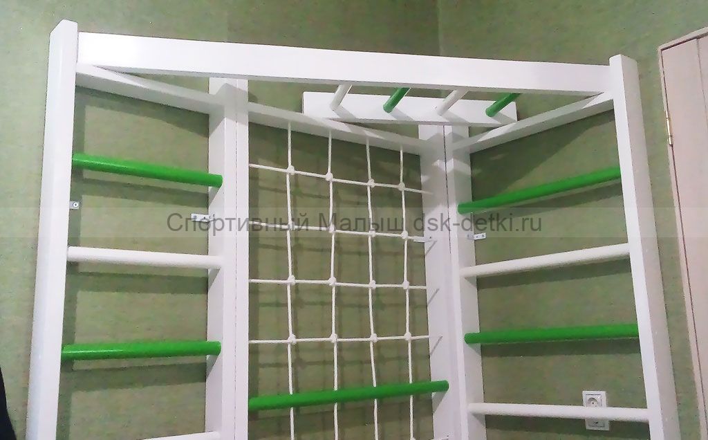 Базовая комплектация модели: три вертикальных секции (две шведских стенки + пиратская сетка), объединенные перемычкой с рукоходом для навешивания гимнастических снарядов + крепеж.
