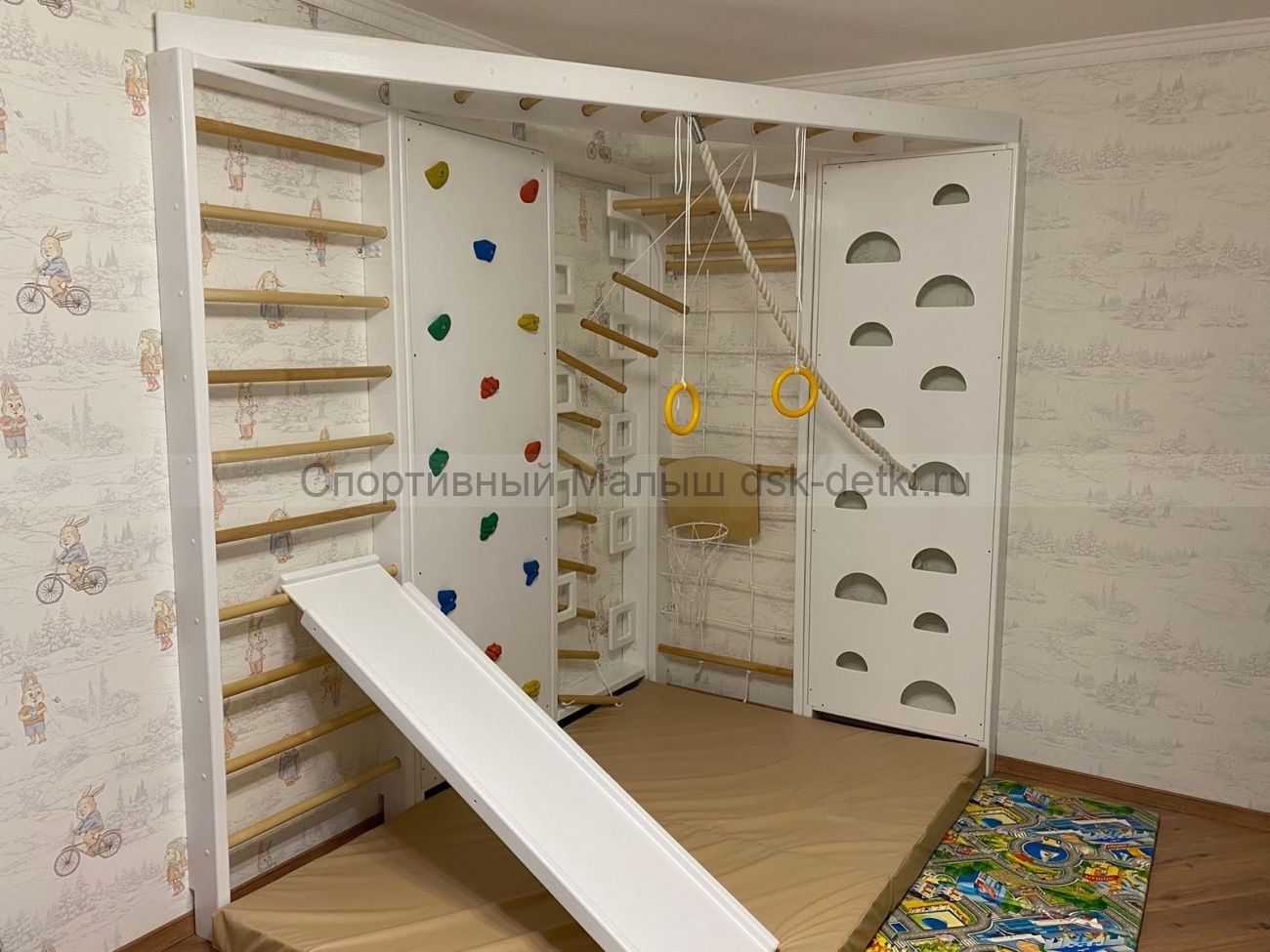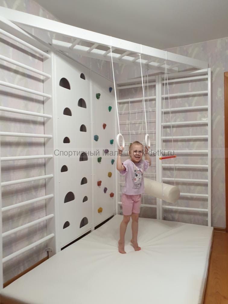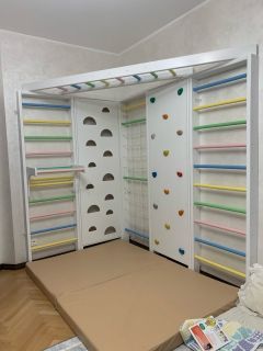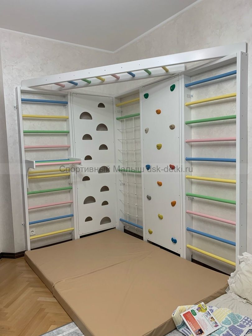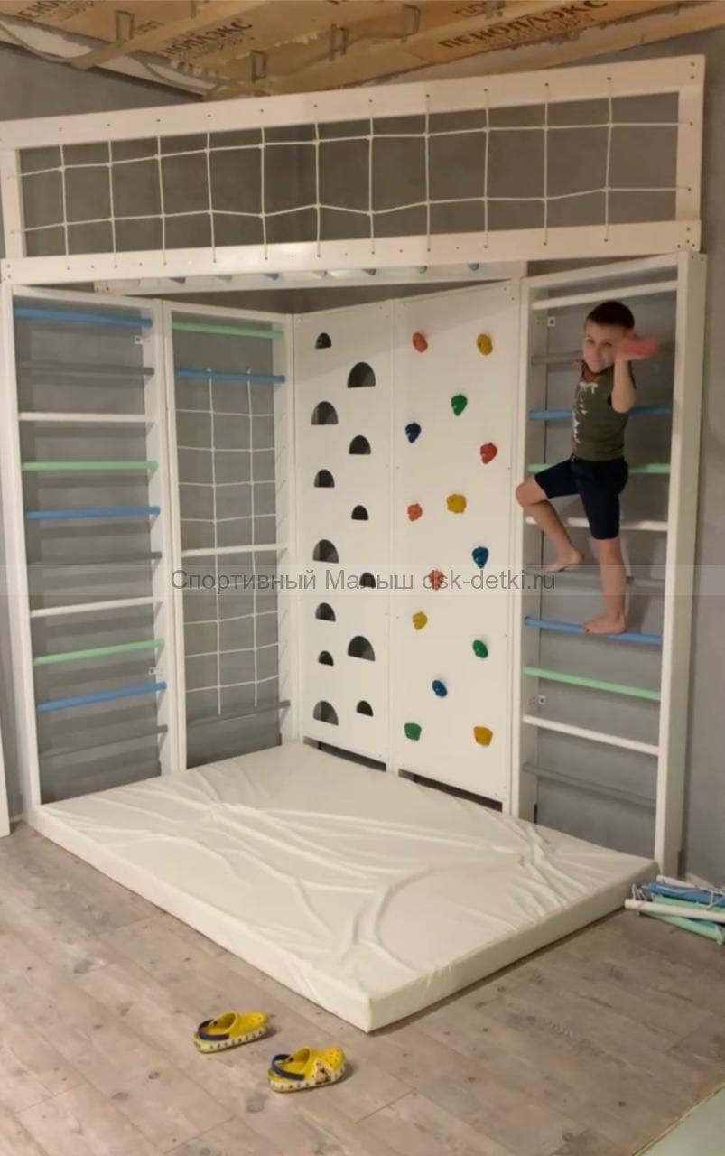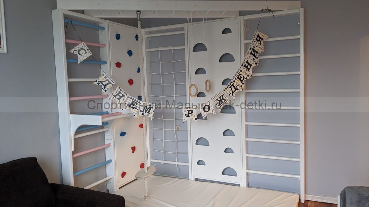 Базовая комплектация модели: пять вертикальных секций (две шведских стенки + пиратская сетка + скалодром-полусферы, скалодром с камнями), объединенные перемычкой с рукоходом для навешивания гимнастических снарядов + крепеж.