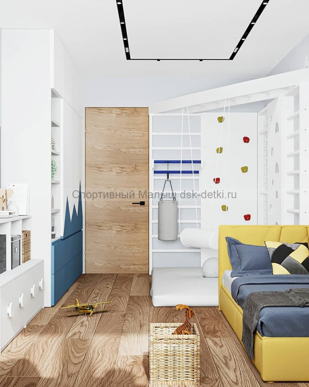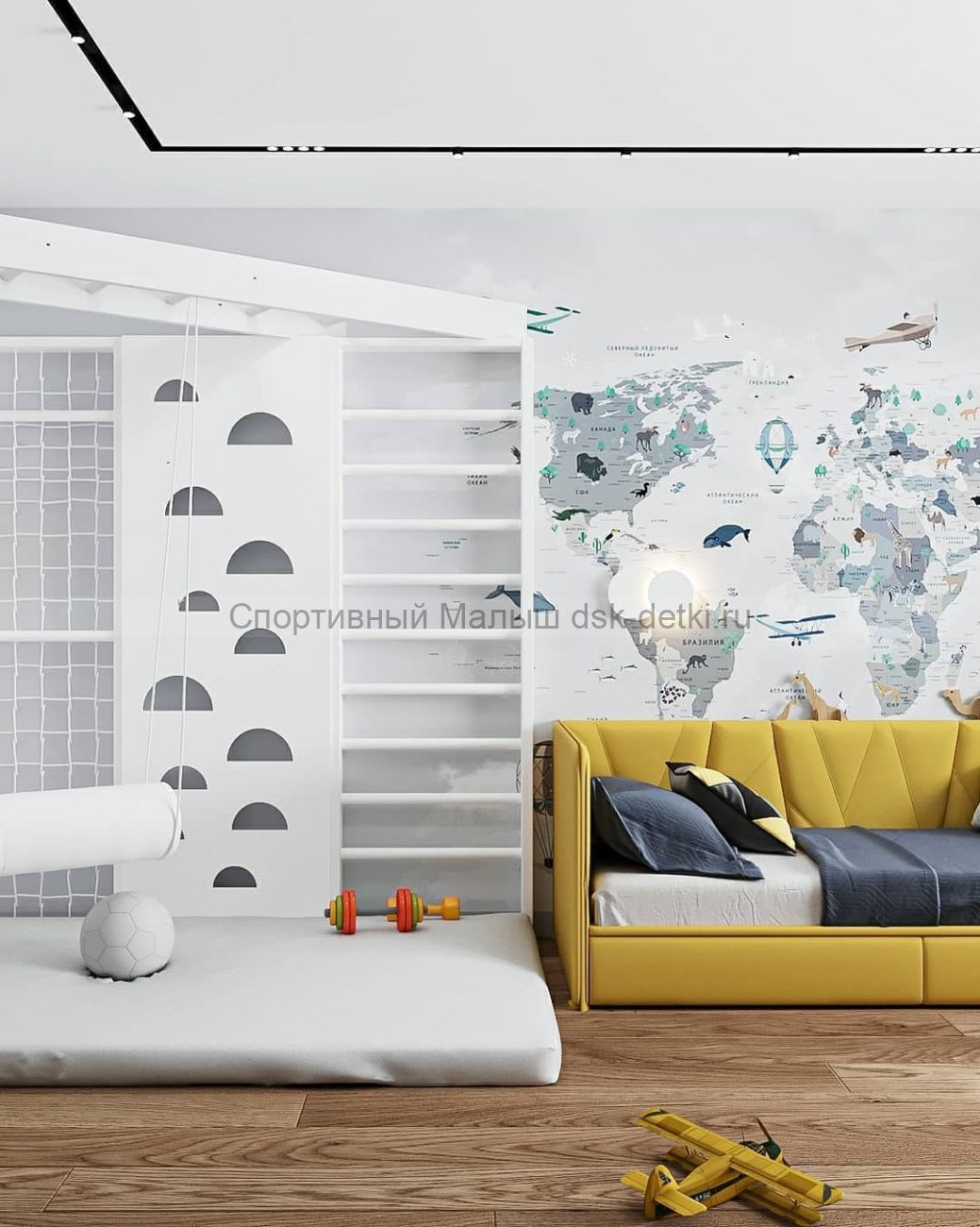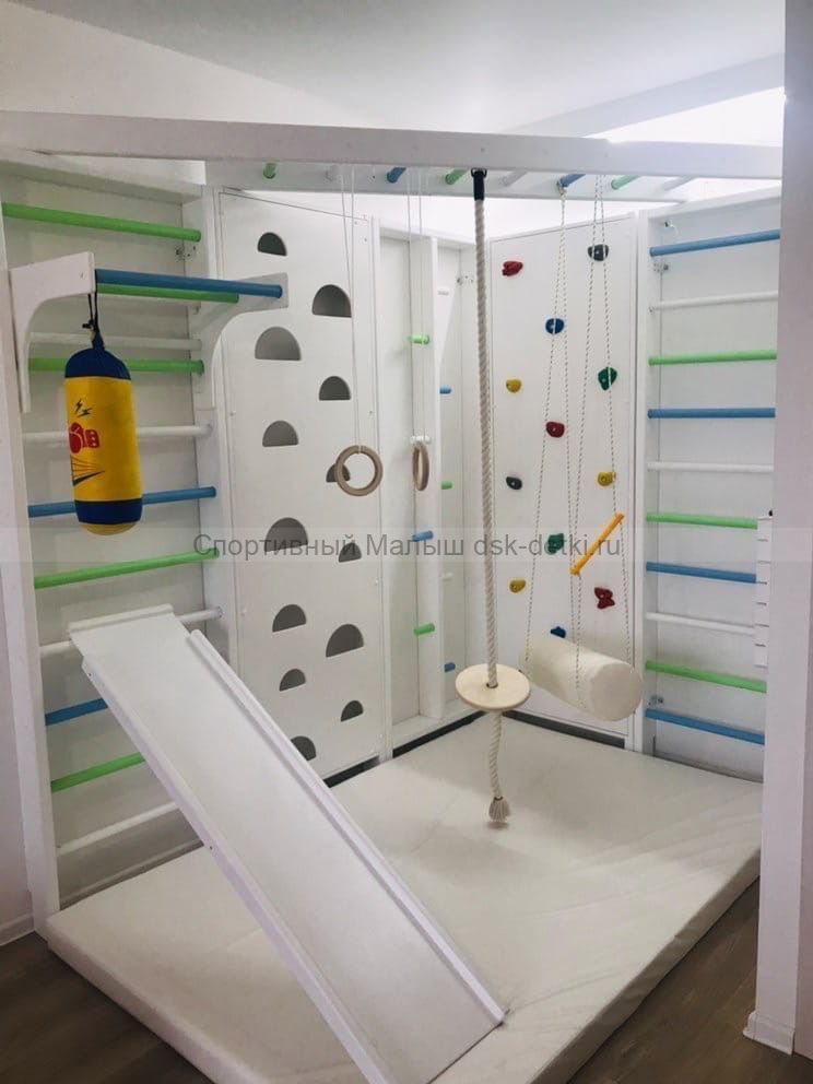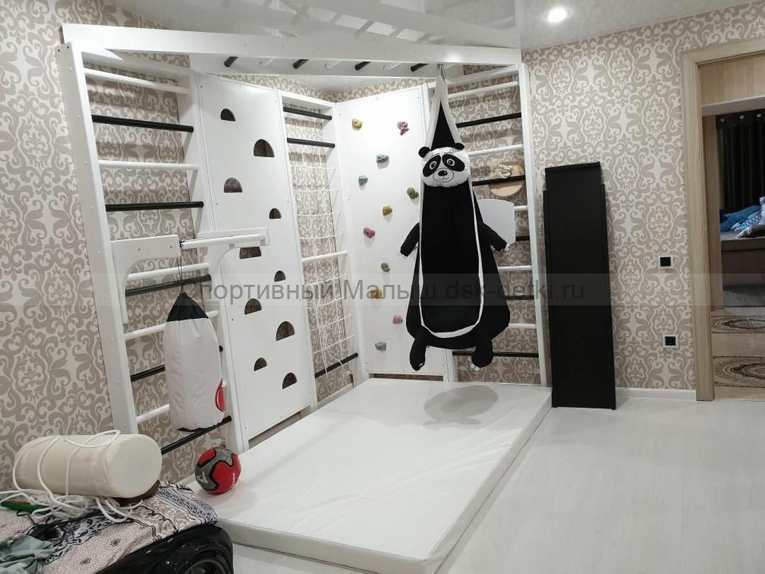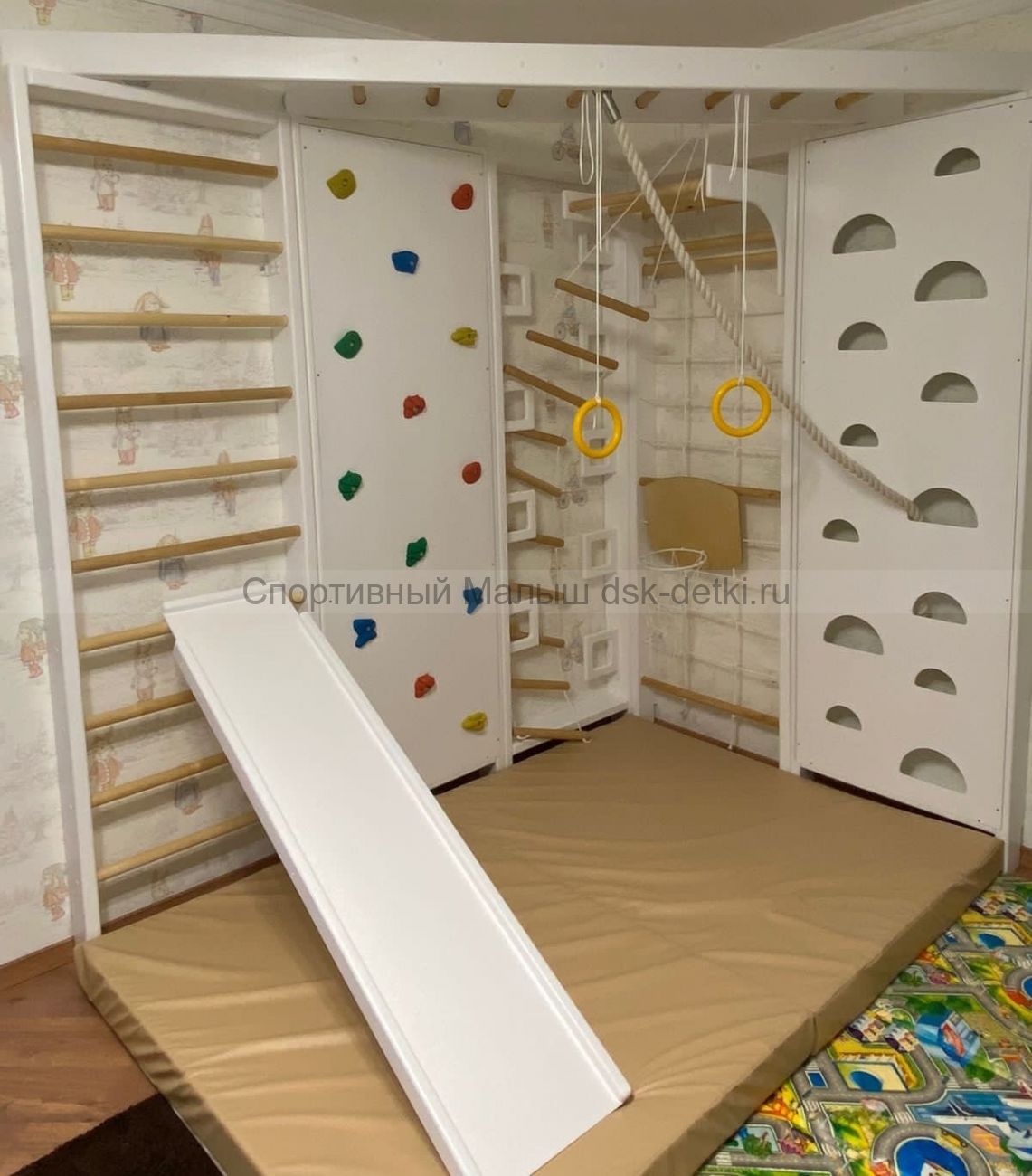 Базовая комплектация модели: пять вертикальных секций (две шведских стенки + пиратская сетка + скалодром-полусферы, скалодром с камнями), объединенные перемычкой с рукоходом для навешивания гимнастических снарядов + крепеж.