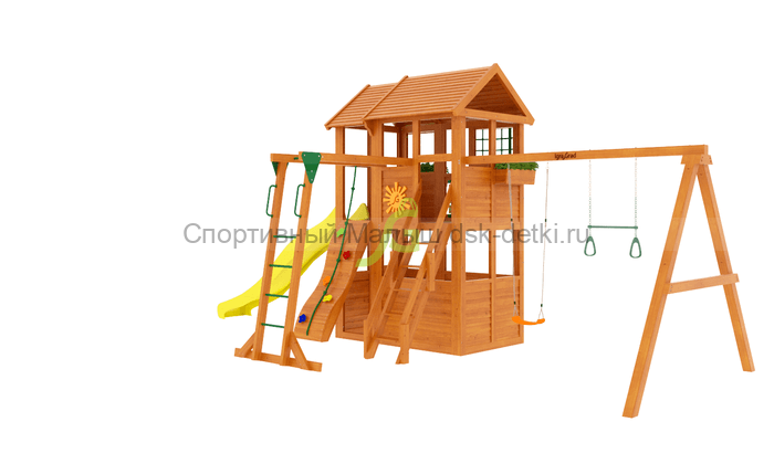 Материал комплекса - сосна, ель. Обработан безопасной защитной пропиткой на водной основе. Она придаёт дереву красивый оттенок и подчёркивает его природную текстуру.