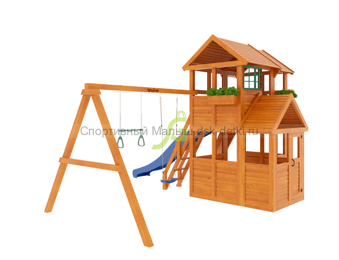 - Закрытый двухуровневый игровой домик с дверью и деревянной крышей;