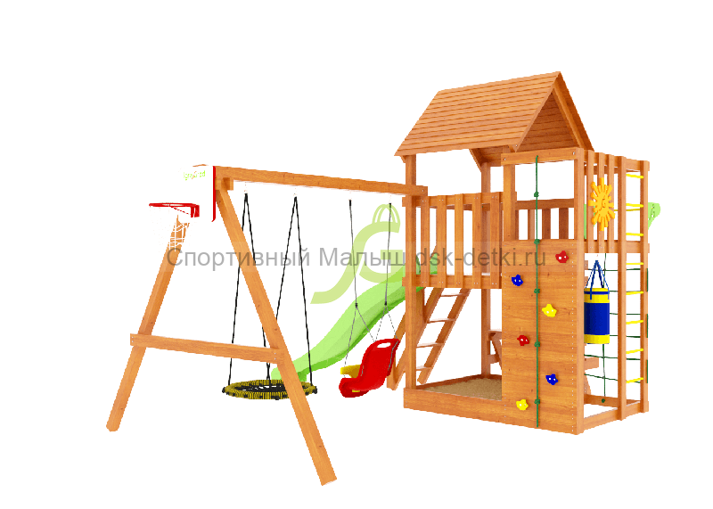 Материал комплекса - сосна, ель. Обработан безопасной защитной пропиткой на водной основе. Она придаёт дереву красивый оттенок и подчёркивает его природную текстуру.