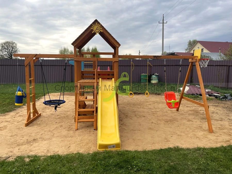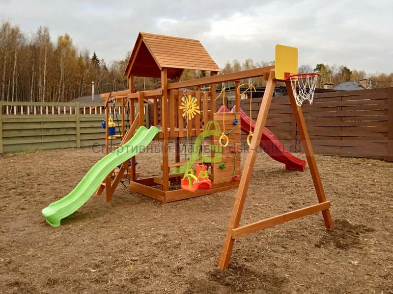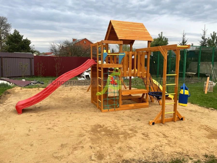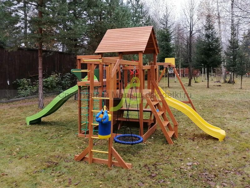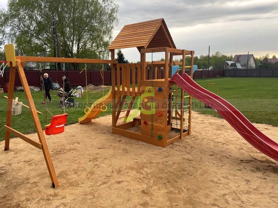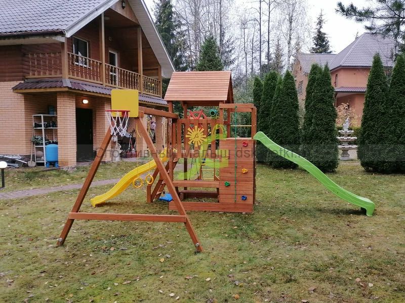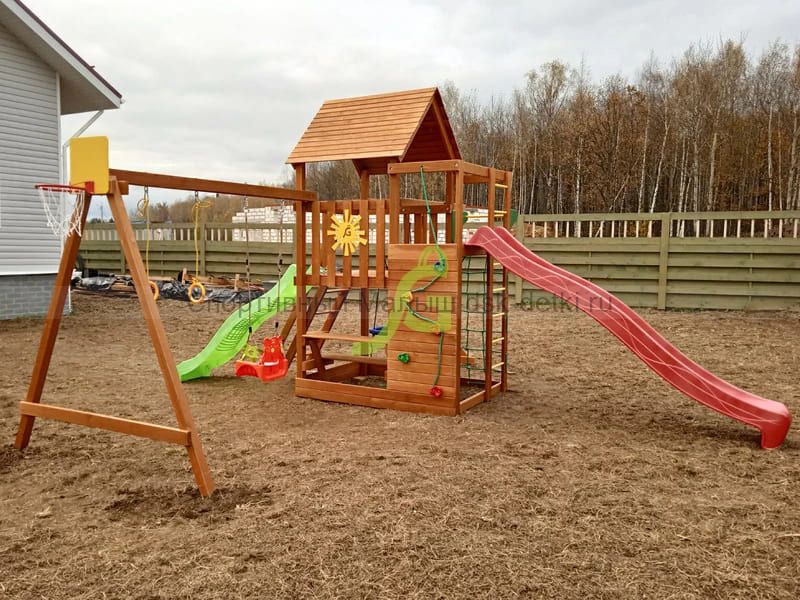 Материал комплекса - сосна, ель. Обработан безопасной защитной пропиткой на водной основе. Она придаёт дереву красивый оттенок и подчёркивает его природную текстуру.