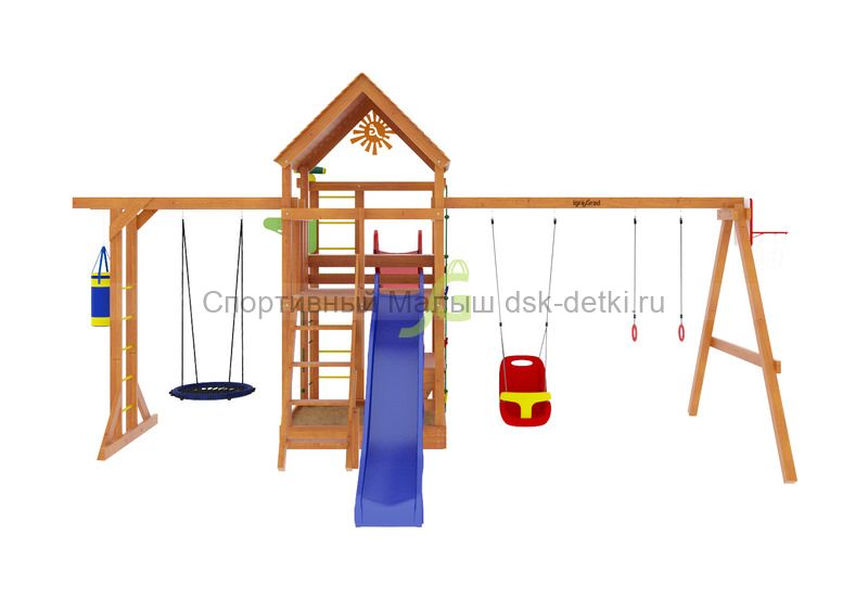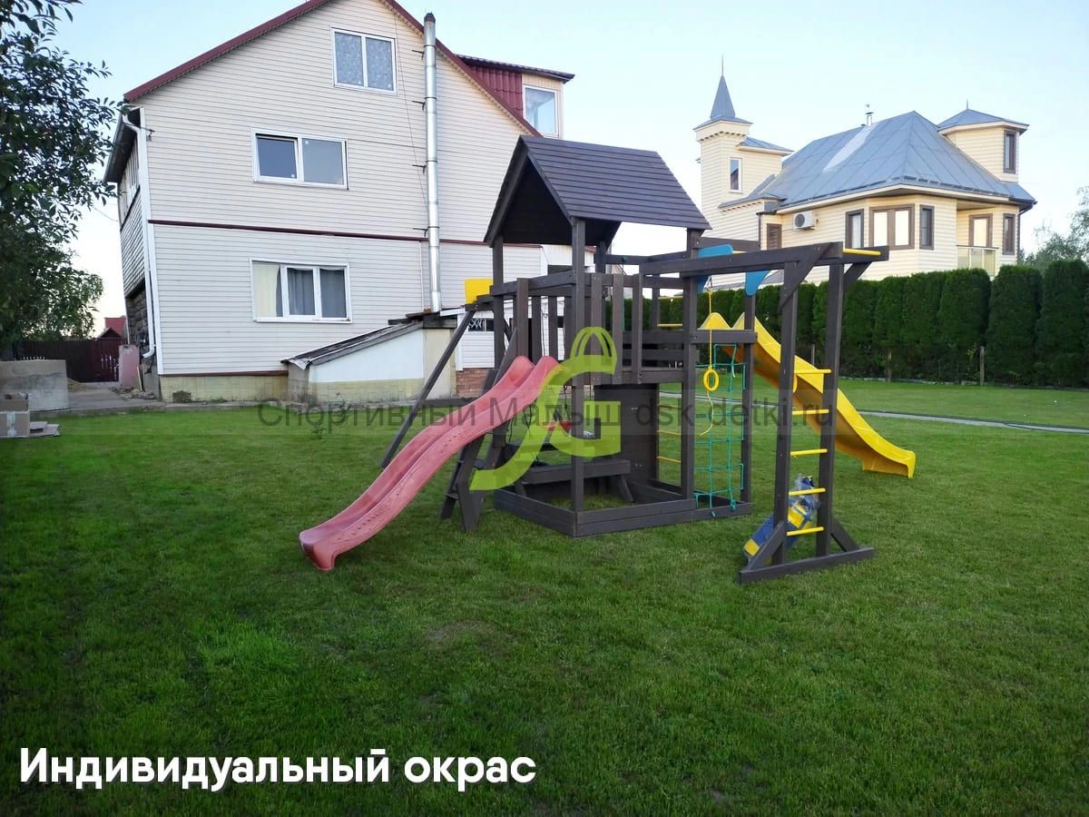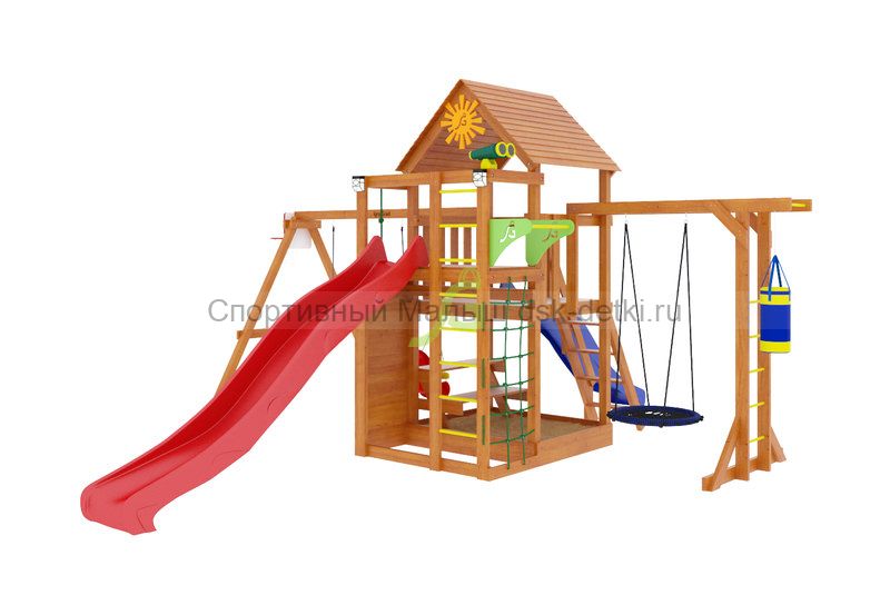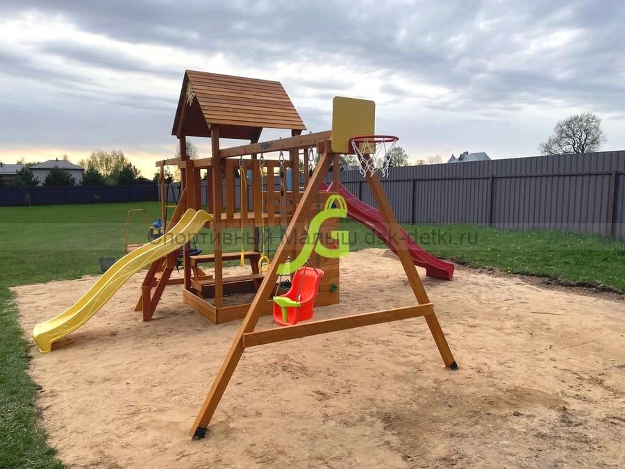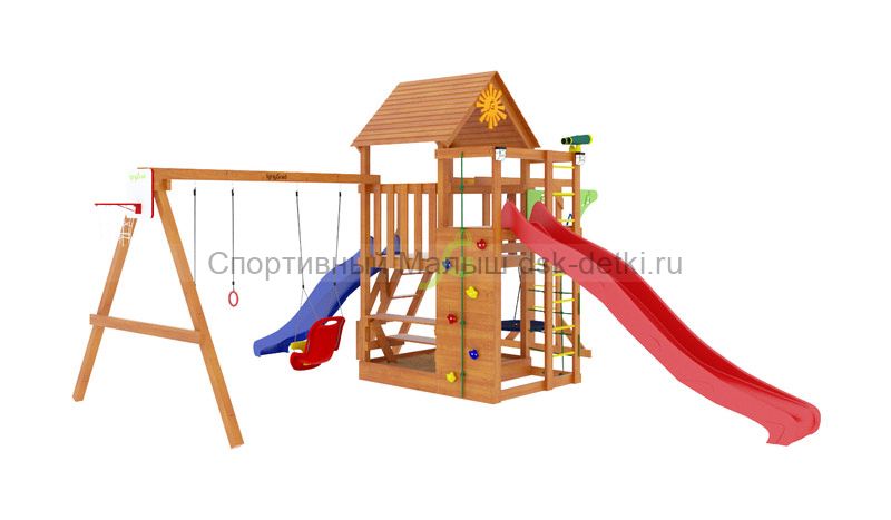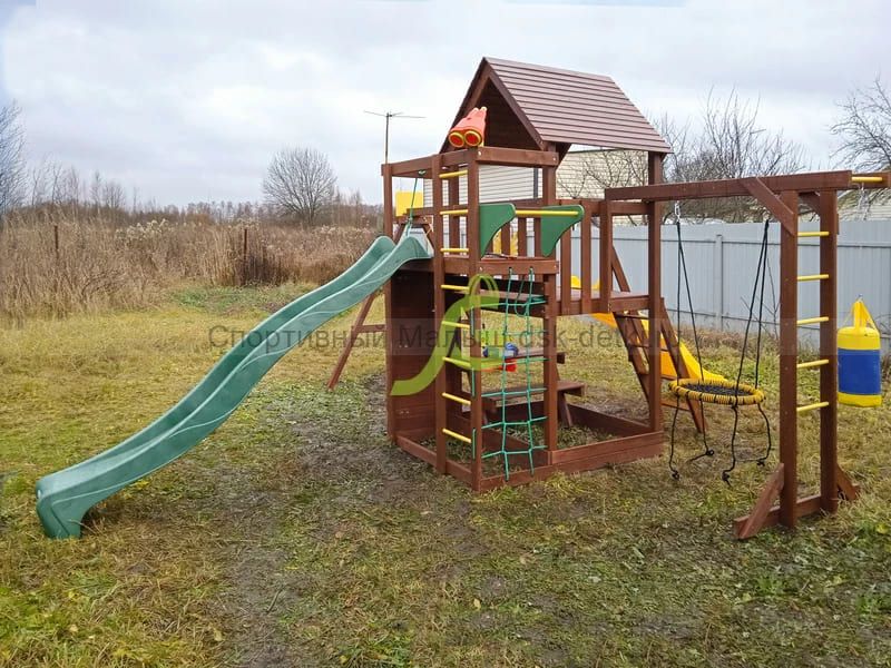 Материал комплекса - сосна, ель. Обработан безопасной защитной пропиткой на водной основе. Она придаёт дереву красивый оттенок и подчёркивает его природную текстуру.