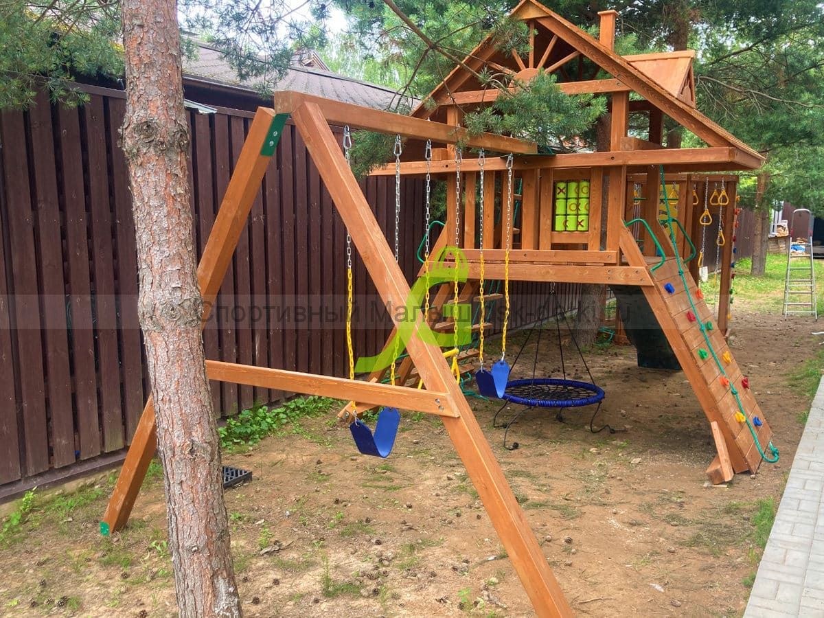 Материал комплекса - сосна, ель. Обработан безопасной защитной пропиткой на водной основе. Она придаёт дереву красивый оттенок и подчёркивает его природную текстуру.