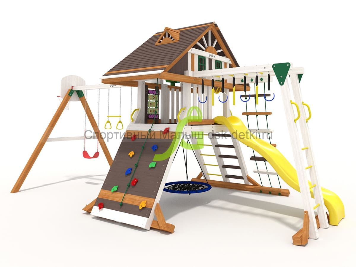 Материал комплекса - сосна, ель. Обработан безопасной защитной пропиткой на водной основе. Она придаёт дереву красивый оттенок и подчёркивает его природную текстуру.