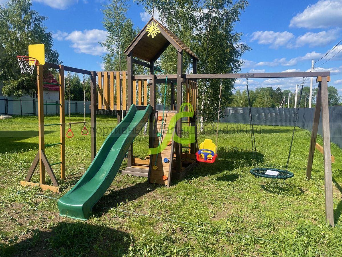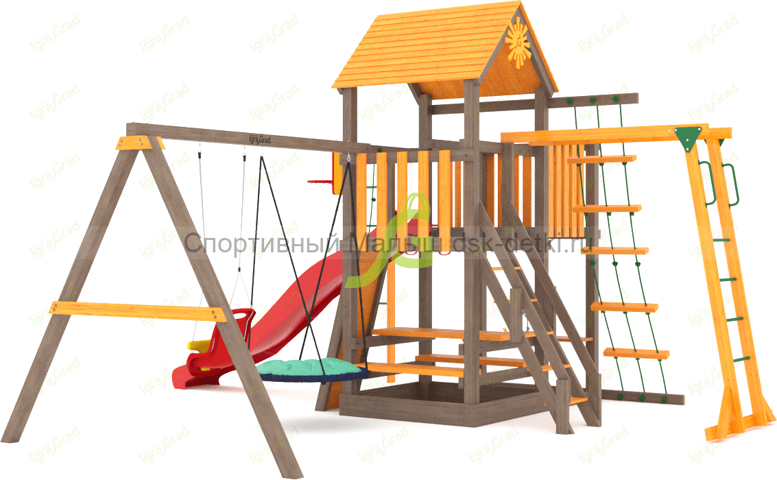 Материал комплекса - сосна, ель. Обработан безопасной защитной пропиткой на водной основе. Она придаёт дереву красивый оттенок и подчёркивает его природную текстуру.