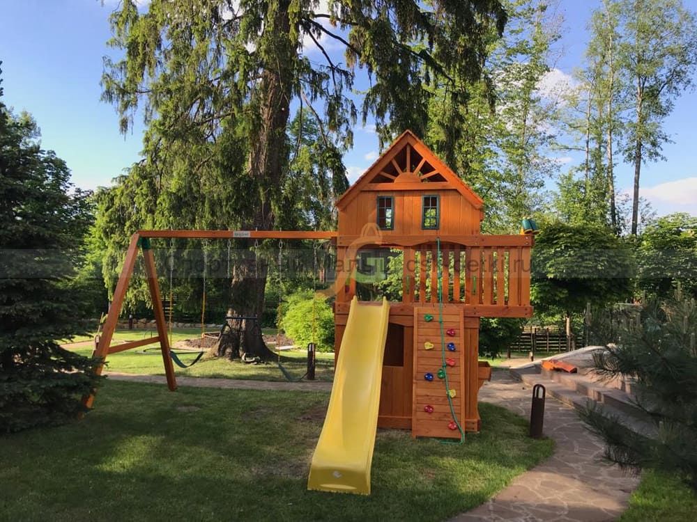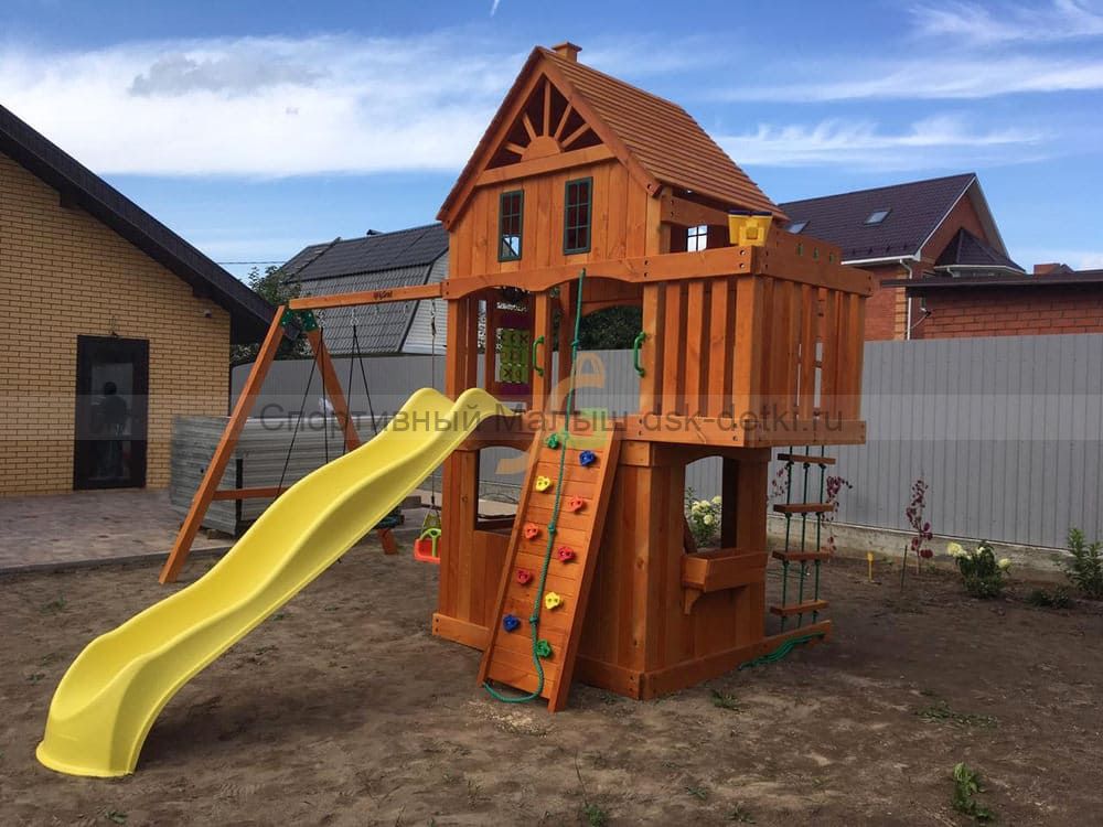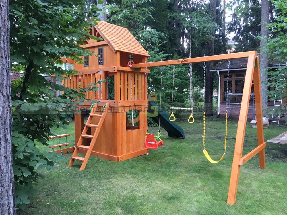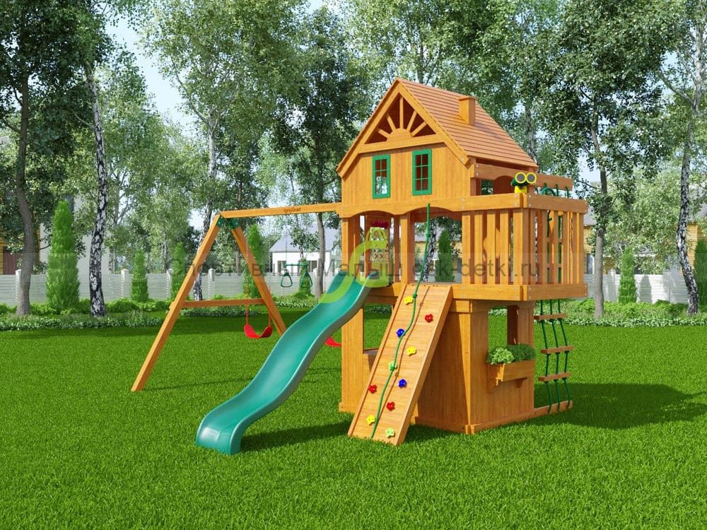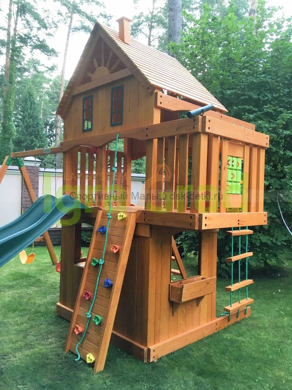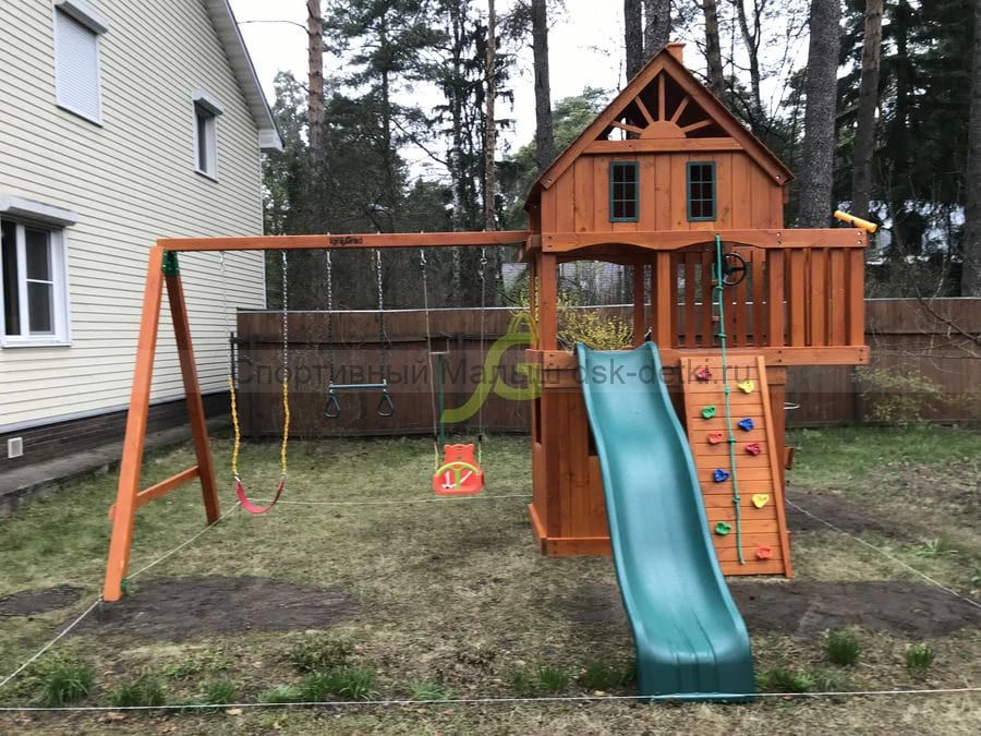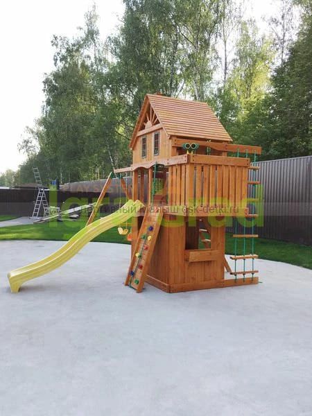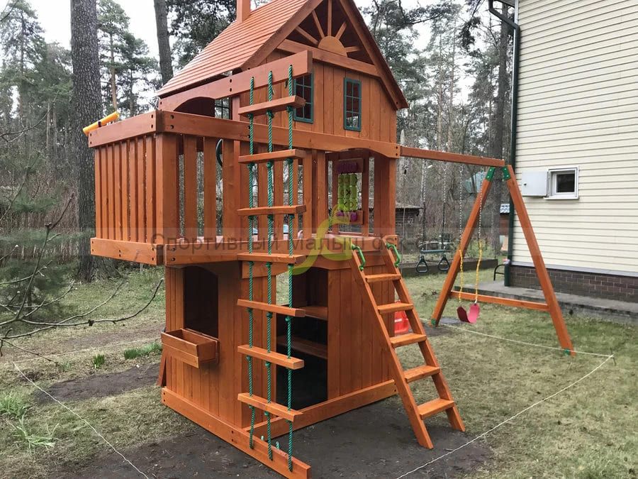 Материал комплекса - сосна, ель. Обработан безопасной защитной пропиткой на водной основе. Она придаёт дереву красивый оттенок и подчёркивает его природную текстуру.