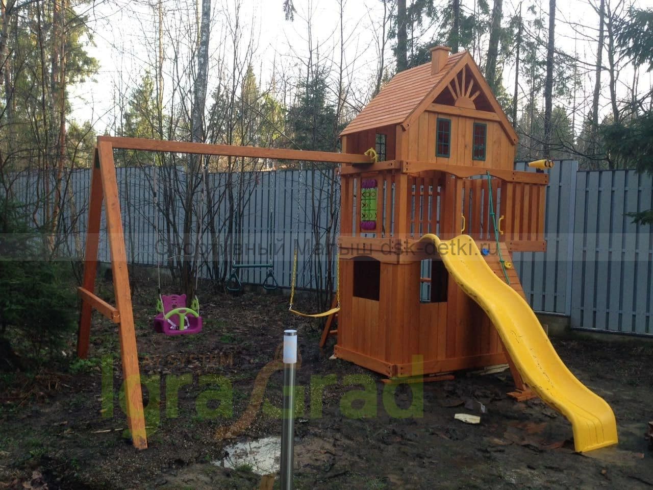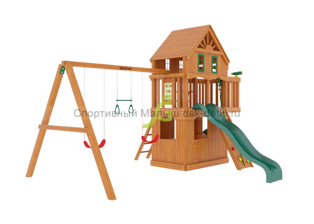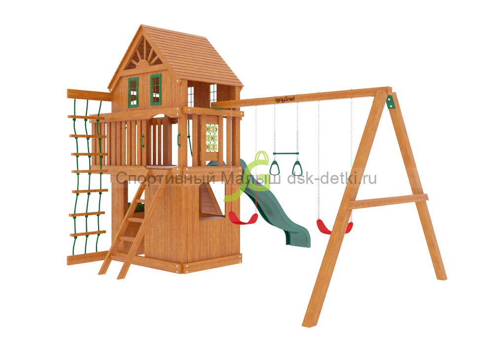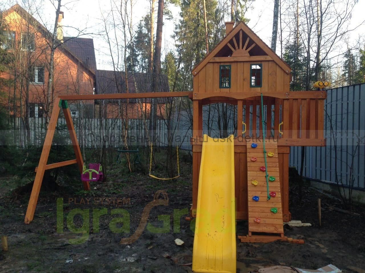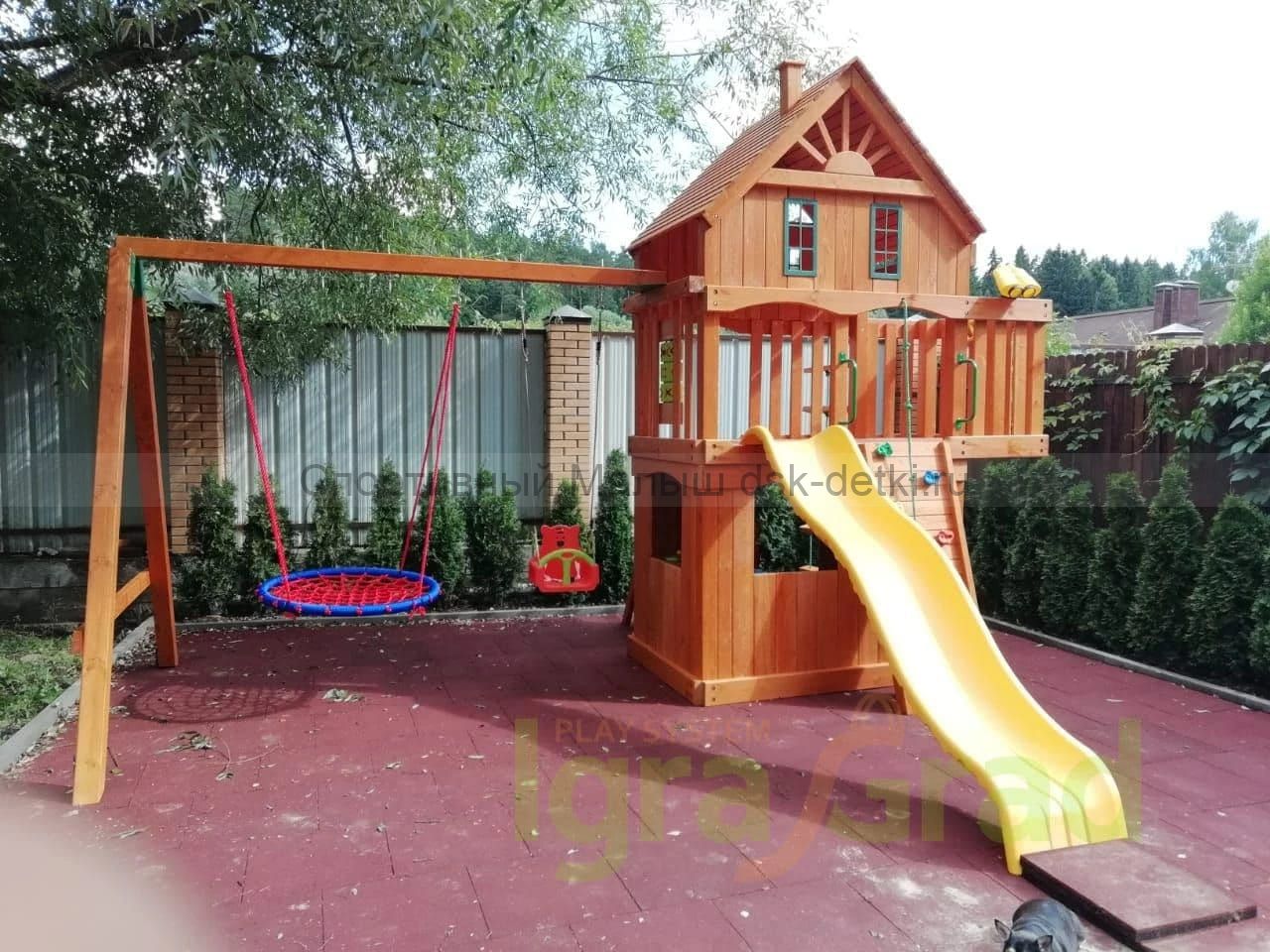 Материал комплекса - сосна, ель. Обработан безопасной защитной пропиткой на водной основе. Она придаёт дереву красивый оттенок и подчёркивает его природную текстуру.