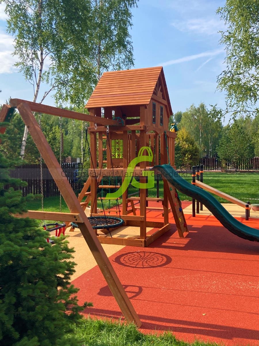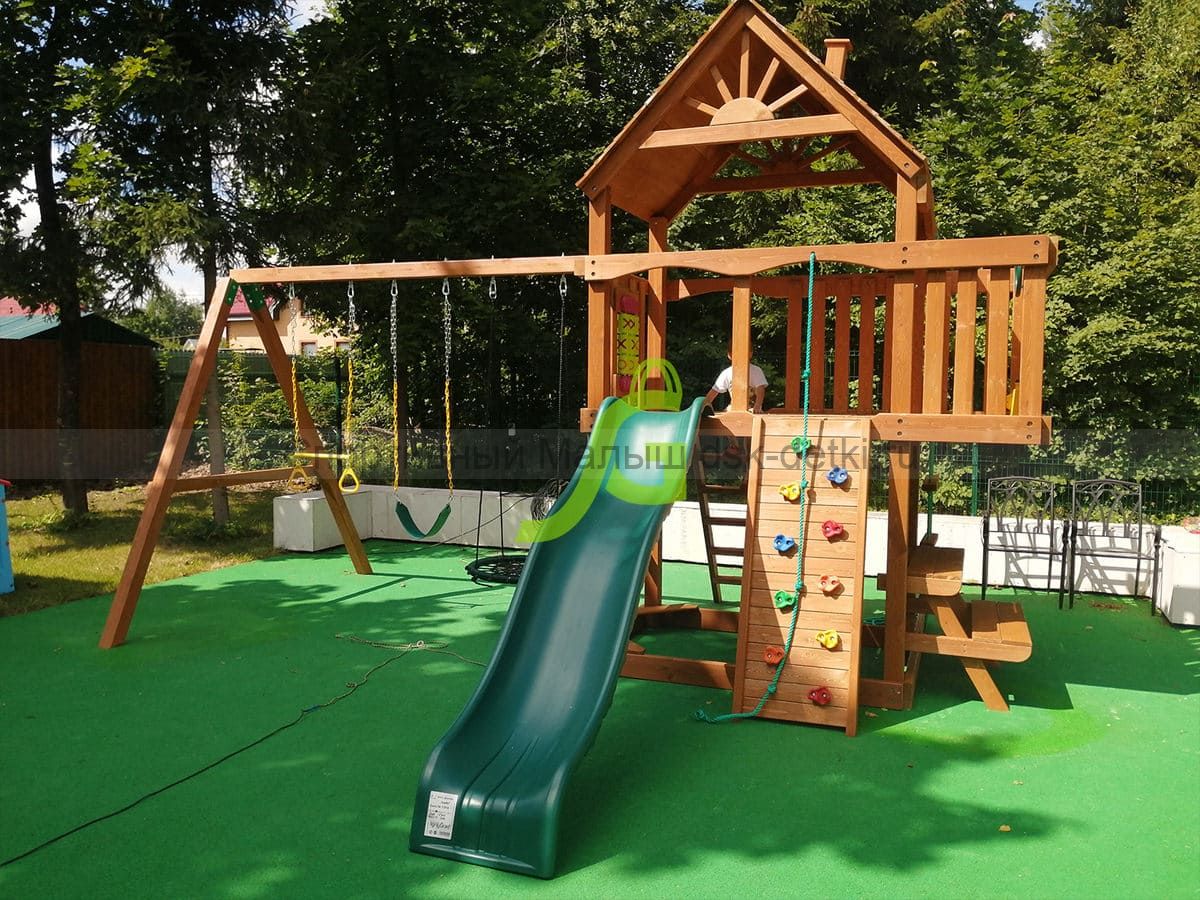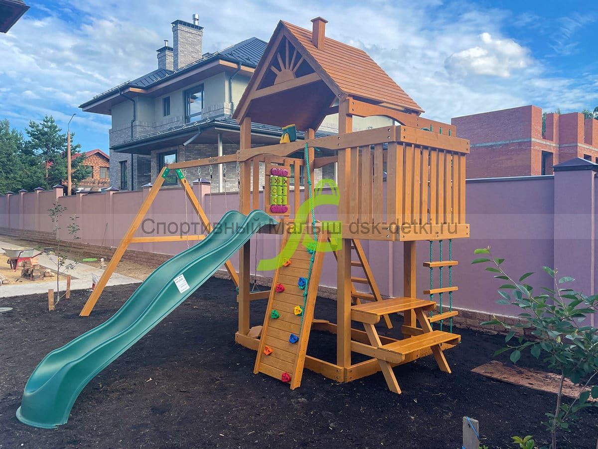 Материал комплекса - сосна, ель. Обработан безопасной защитной пропиткой на водной основе. Она придаёт дереву красивый оттенок и подчёркивает его природную текстуру.