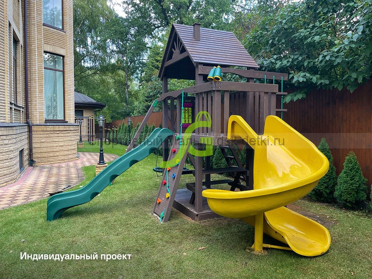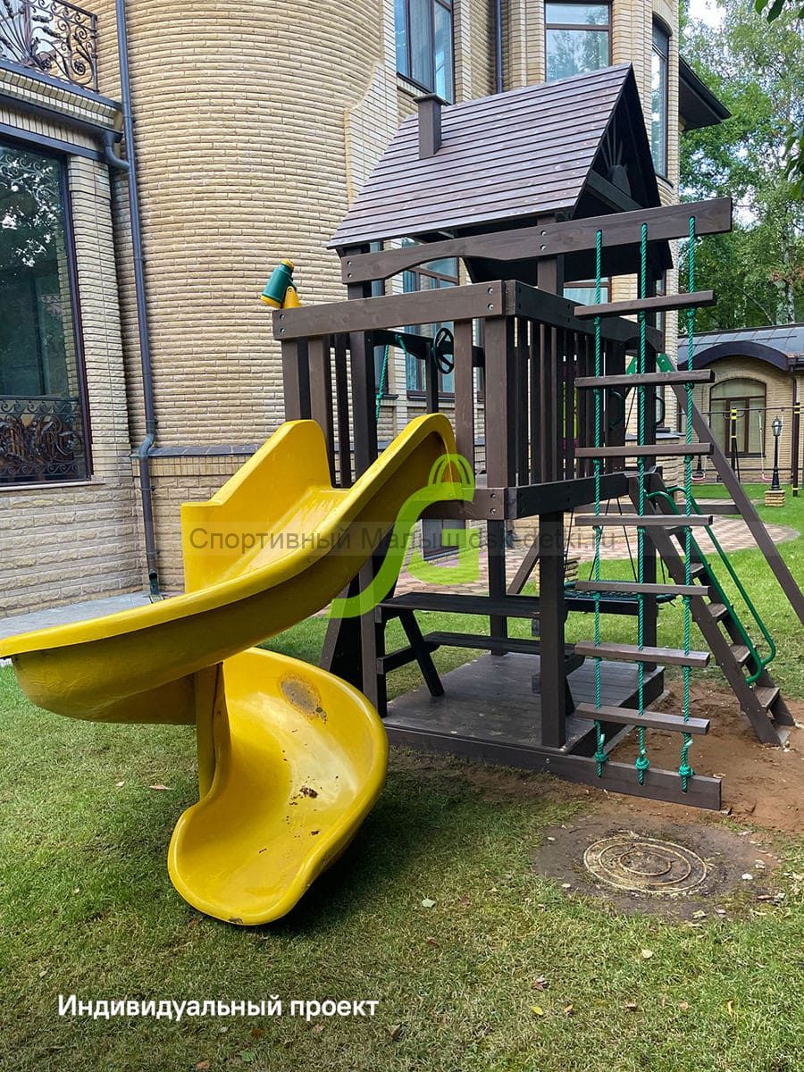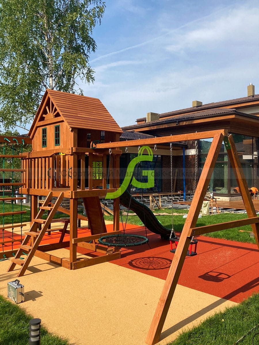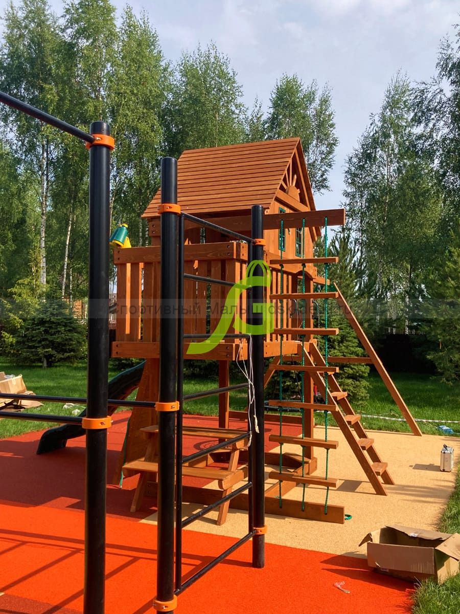 Материал комплекса - сосна, ель. Обработан безопасной защитной пропиткой на водной основе. Она придаёт дереву красивый оттенок и подчёркивает его природную текстуру.