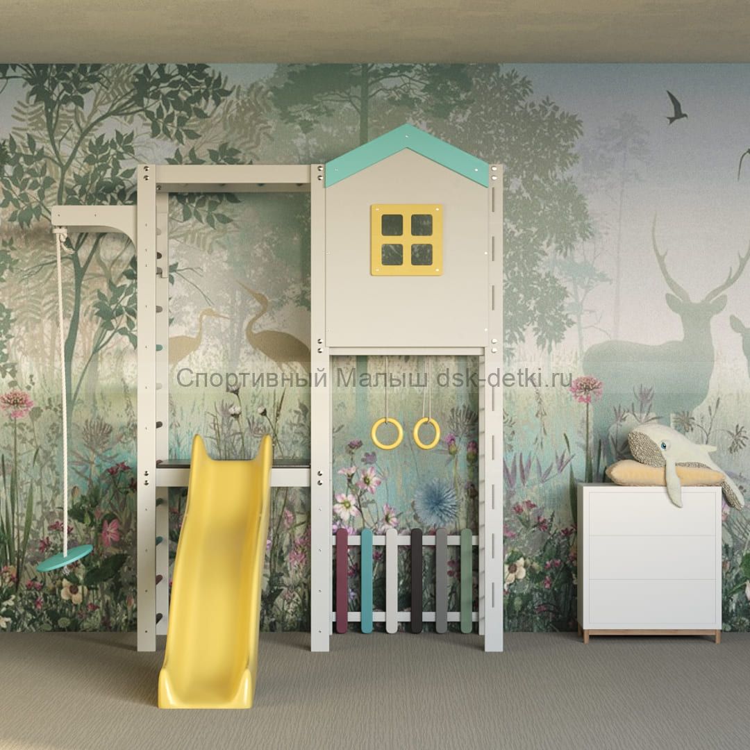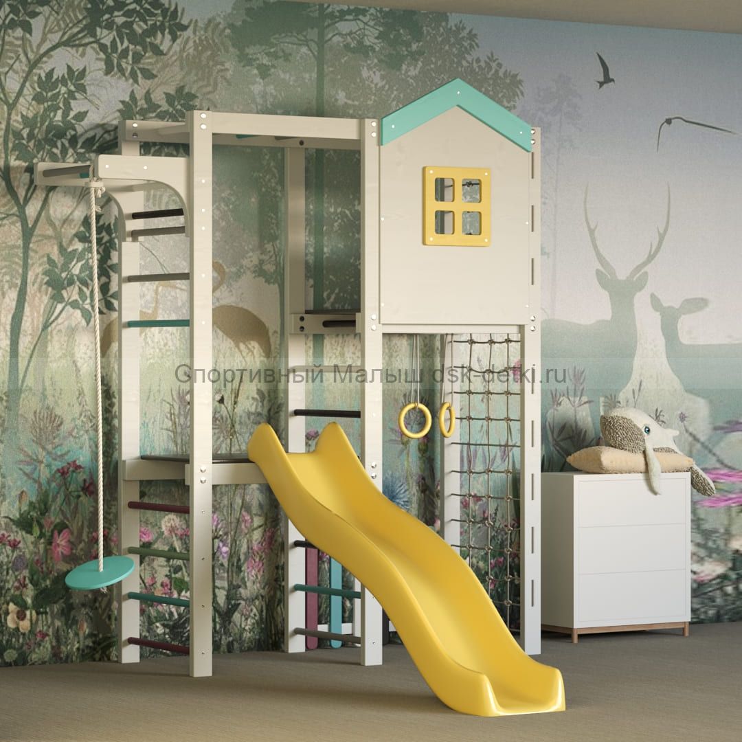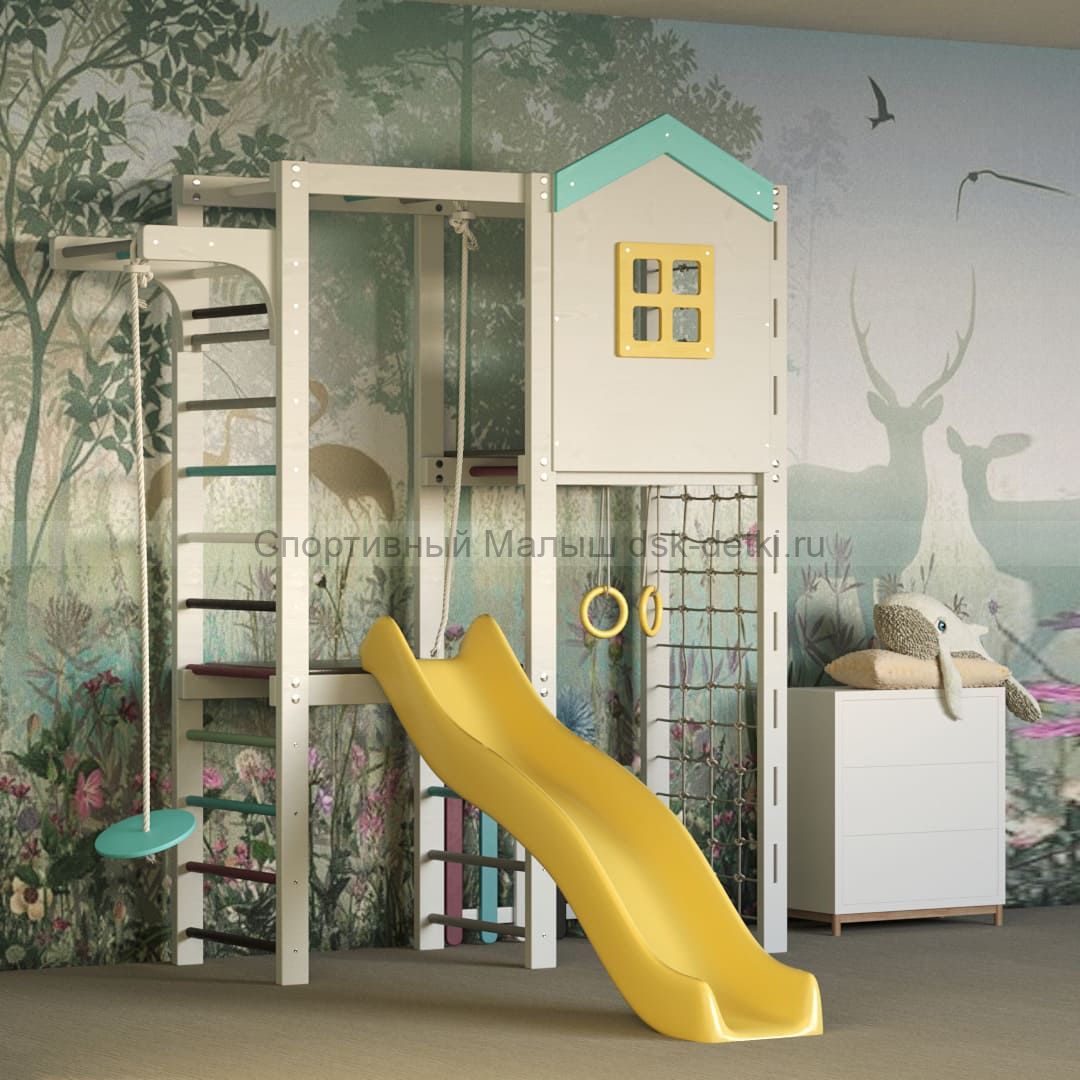 Гимнастический мат, пластиковая горка, навесной турник, кольца, диск на канат НЕ входит в базовую комплектацию - приобретаются отдельно по желанию.