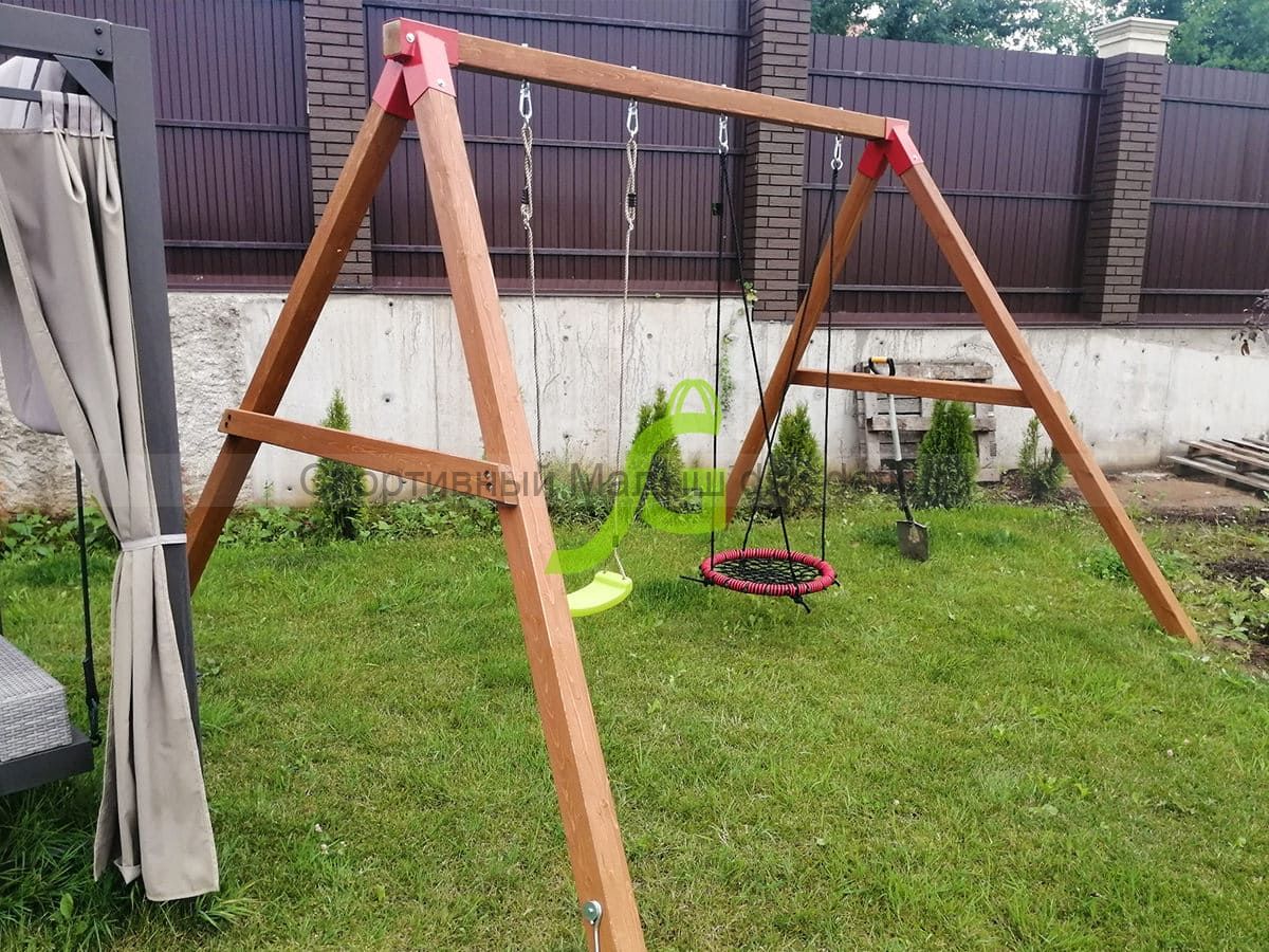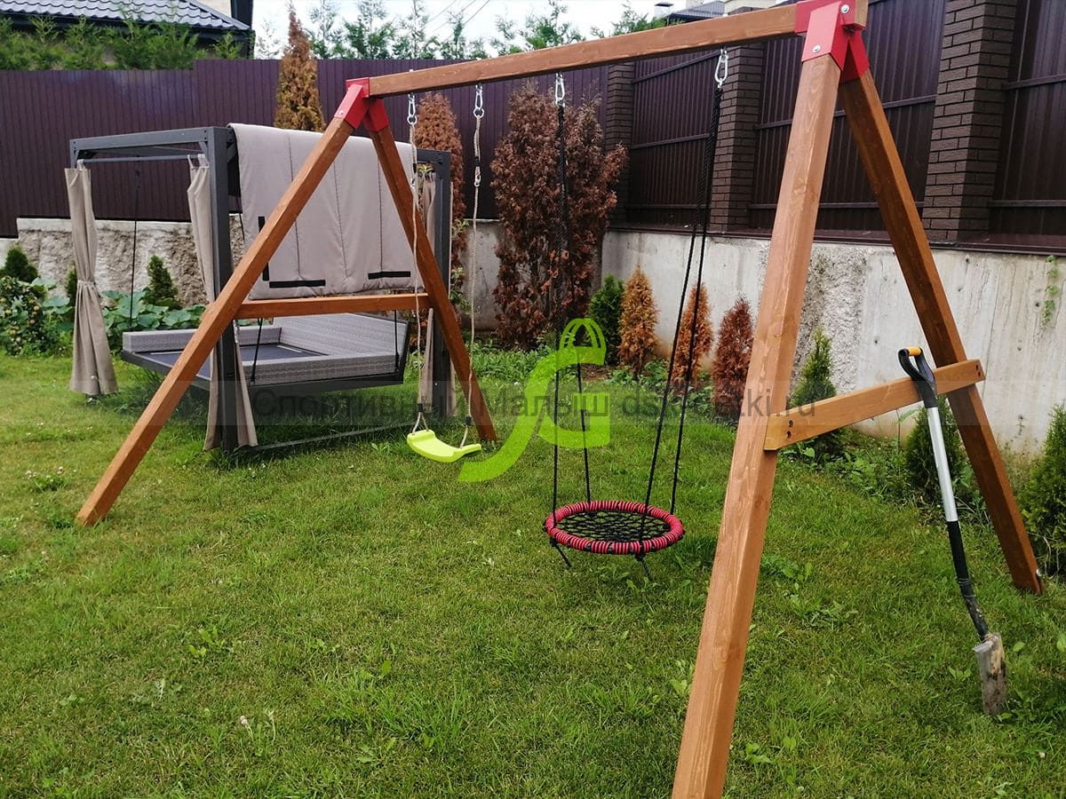 Опорные элементы изготовлены из клееного бруса камерной сушки 90х90 мм. Они широко установлены между собой и скреплены металлическими соединениями и болтами для устойчивости конструкции. Длина поперечной балки позволяет закрепить качель гнездо-паутинка и одиночную качель.