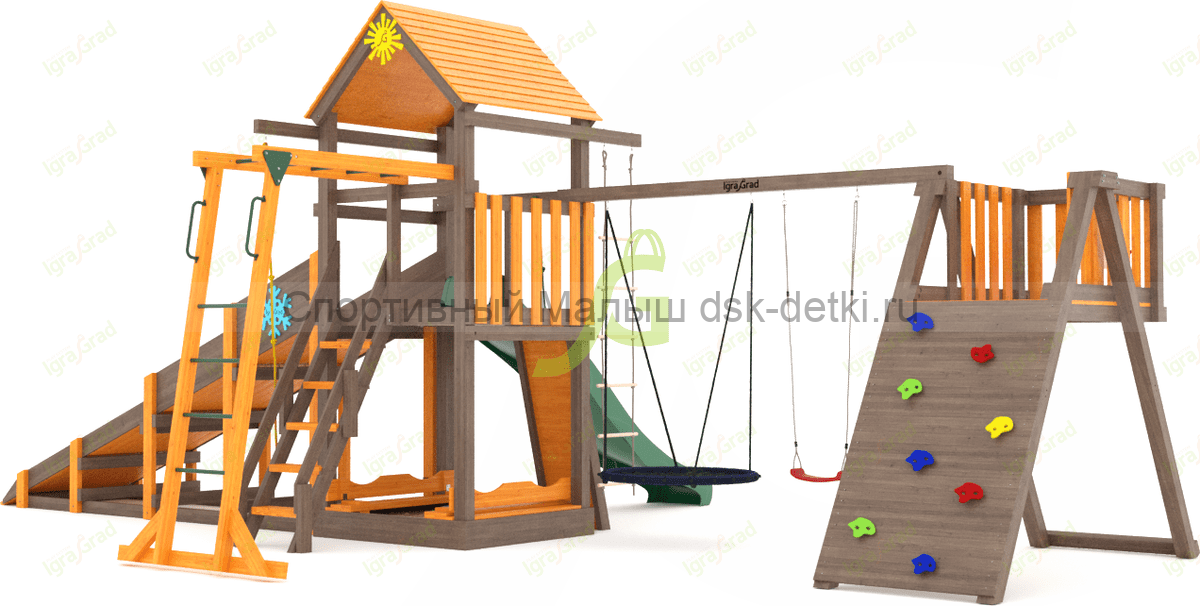 Материал комплекса - сосна, ель. Обработан безопасной защитной пропиткой на водной основе. Она придаёт дереву красивый оттенок и подчёркивает его природную текстуру.