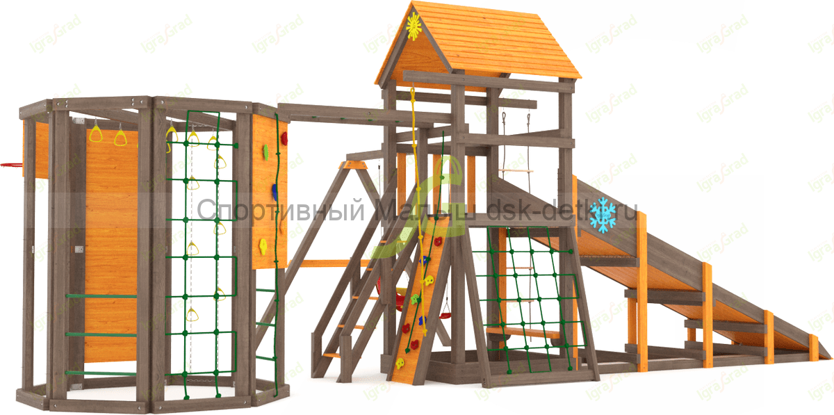 Материал комплекса - сосна, ель. Обработан безопасной защитной пропиткой на водной основе. Она придаёт дереву красивый оттенок и подчёркивает его природную текстуру.