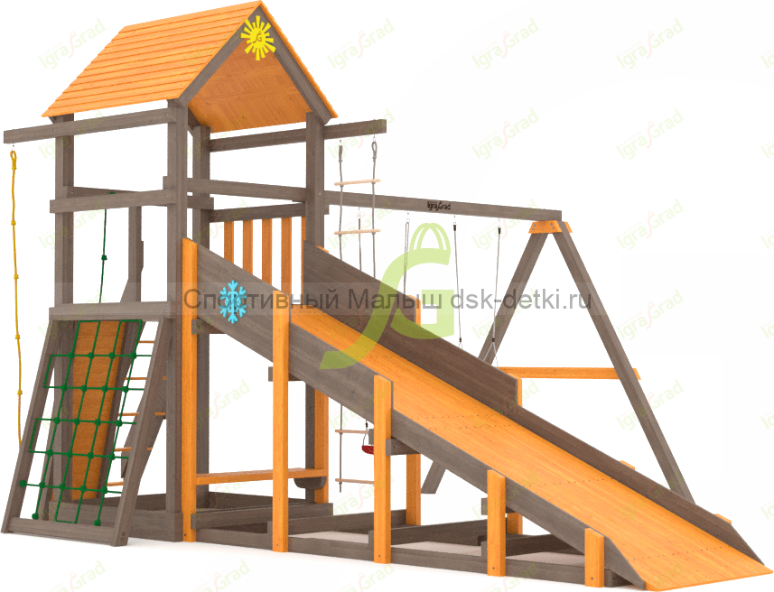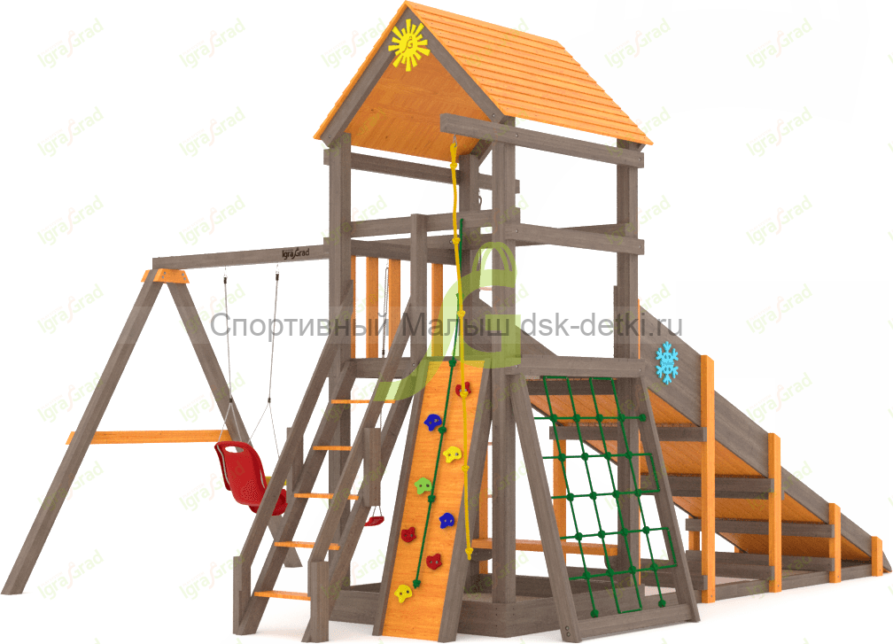 Материал комплекса - сосна, ель. Обработан безопасной защитной пропиткой на водной основе. Она придаёт дереву красивый оттенок и подчёркивает его природную текстуру.