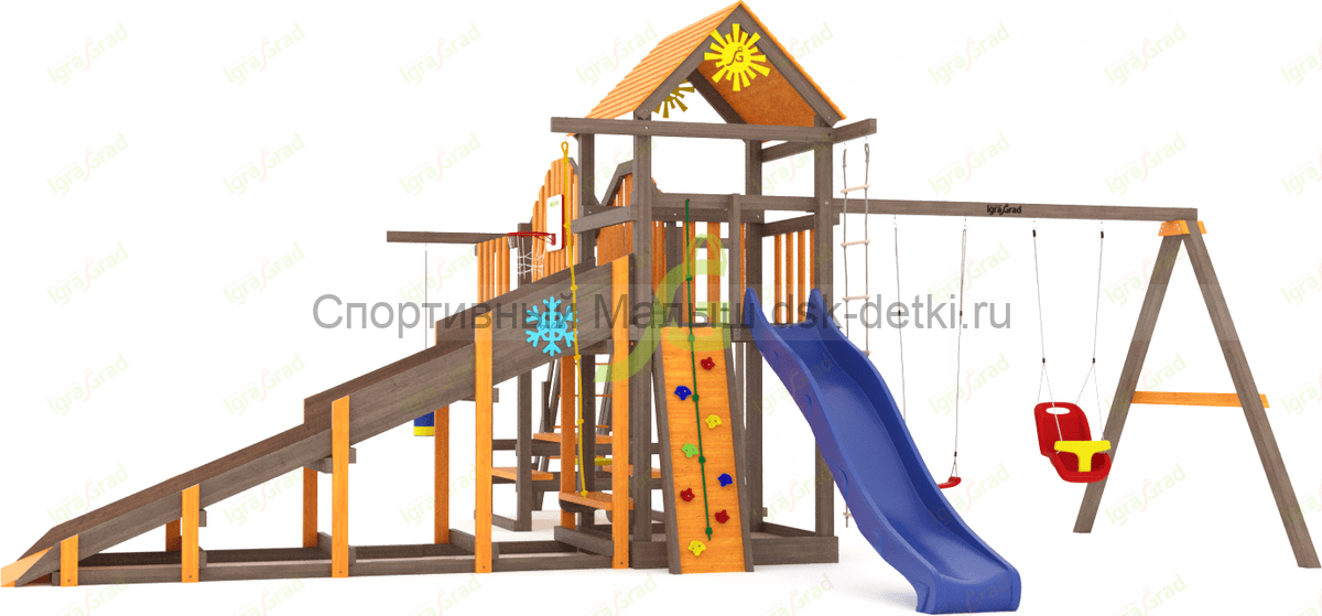 Материал комплекса - сосна, ель. Обработан безопасной защитной пропиткой на водной основе. Она придаёт дереву красивый оттенок и подчёркивает его природную текстуру.