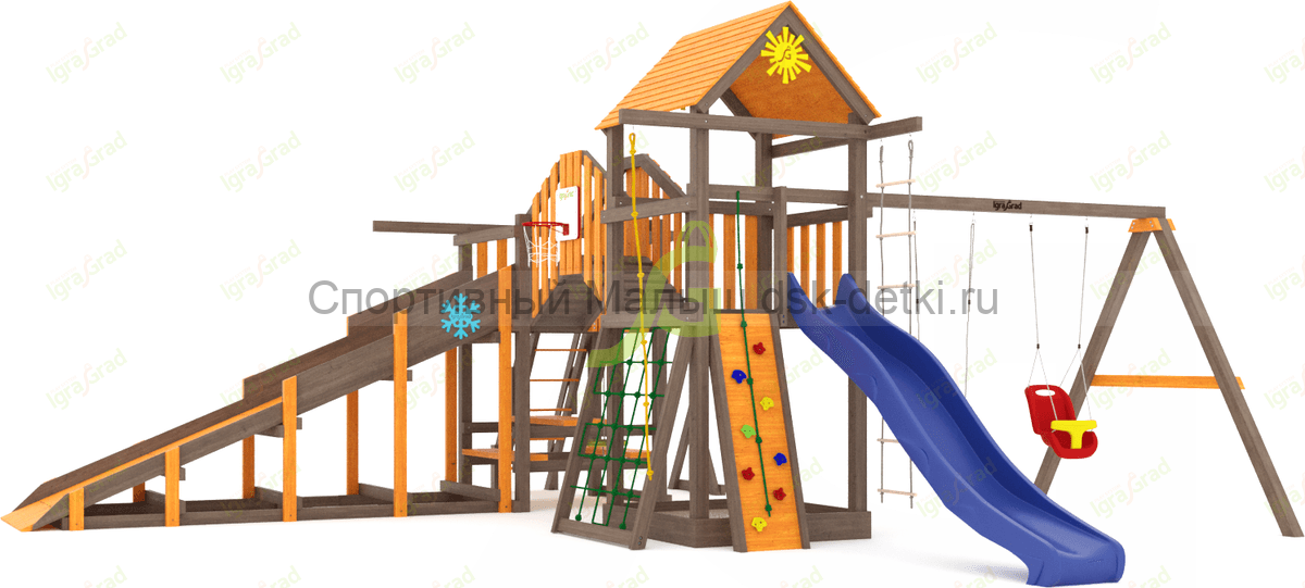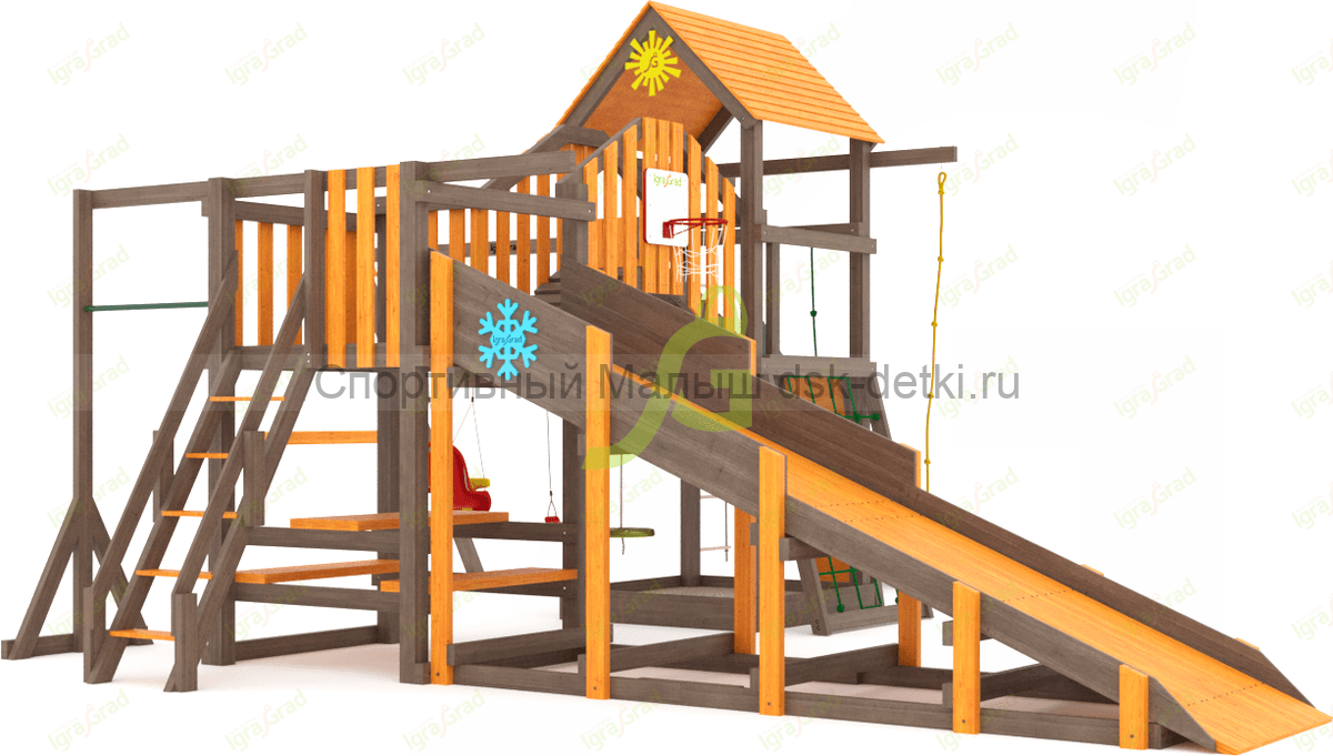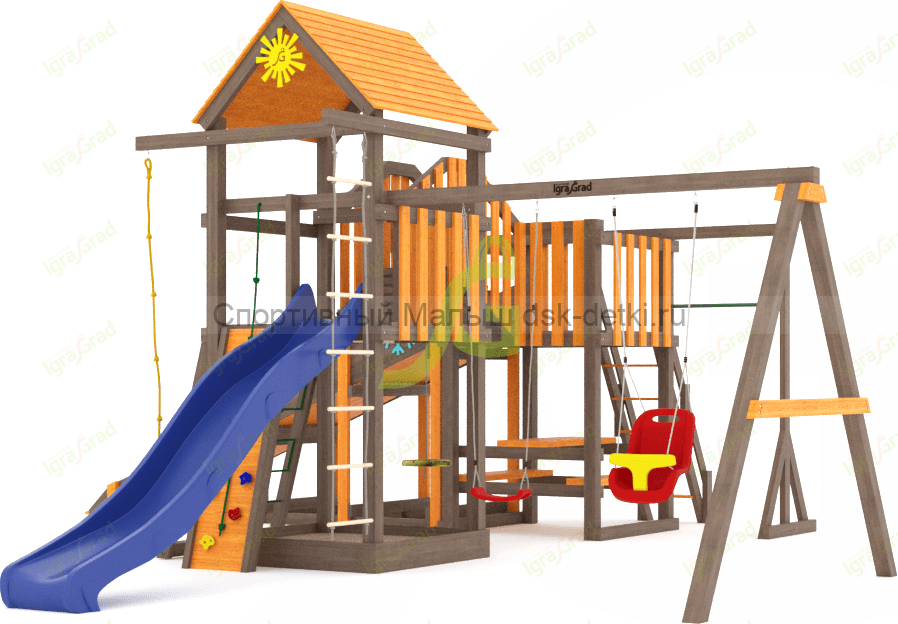 Материал комплекса - сосна, ель. Обработан безопасной защитной пропиткой на водной основе. Она придаёт дереву красивый оттенок и подчёркивает его природную текстуру.